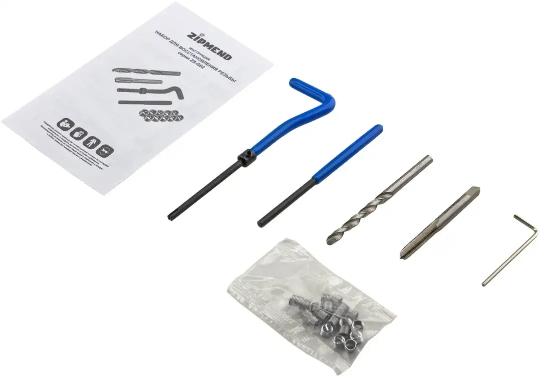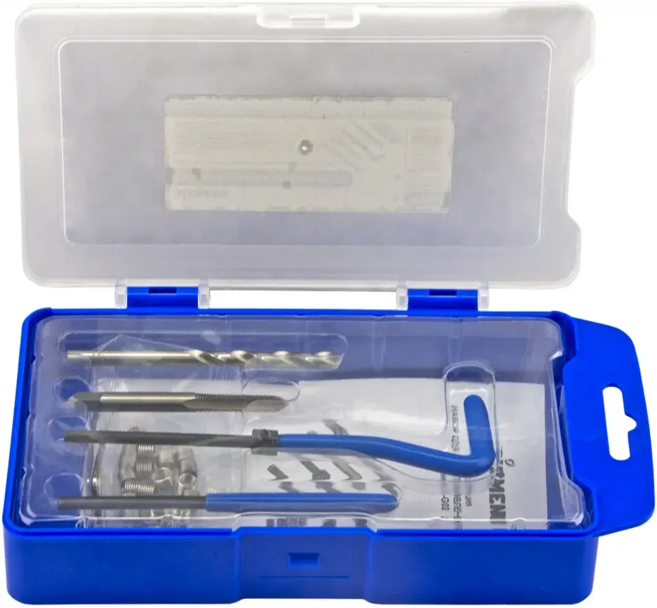 - Применение данного набора обеспечивает быстрое восстановление поврежденной резьбы при помощи специальных приспособлений.