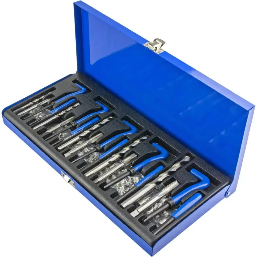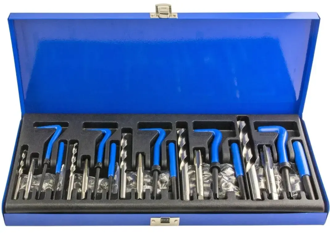 - Применение данного набора обеспечивает быстрое восстановление поврежденной резьбы при помощи специальных приспособлений.