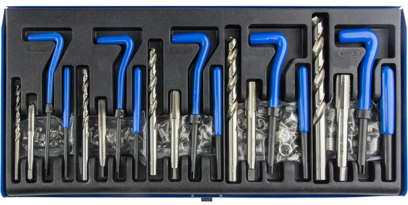 - Набор включает в себя инструмент для восстановления 5-и типоразмеров резьб, таких как М5 х 0.8 , М6 х 1, М8 х 1.25, М10 х 1.5, М12 х 1.75.