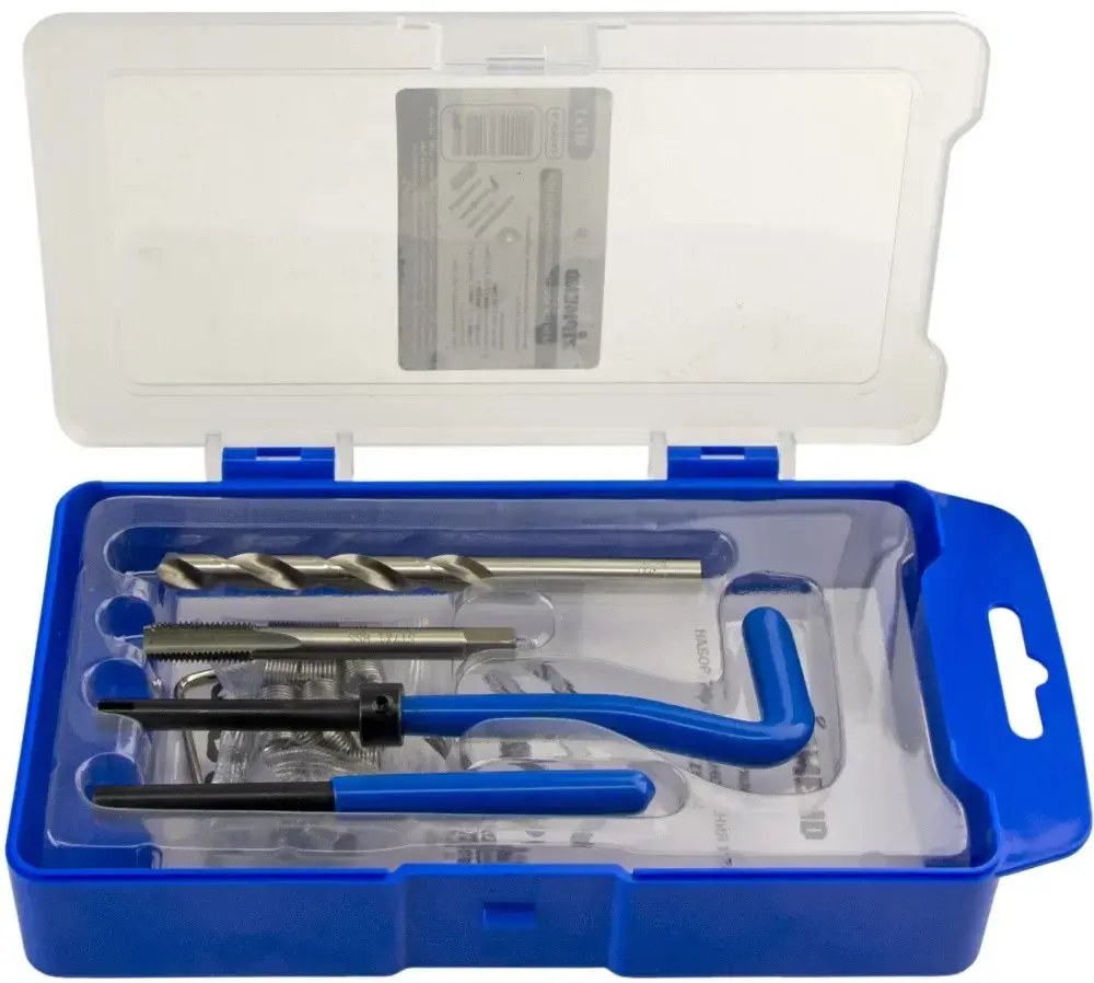 - Применение данного набора обеспечивает быстрое восстановление поврежденной резьбы при помощи специальных приспособлений.