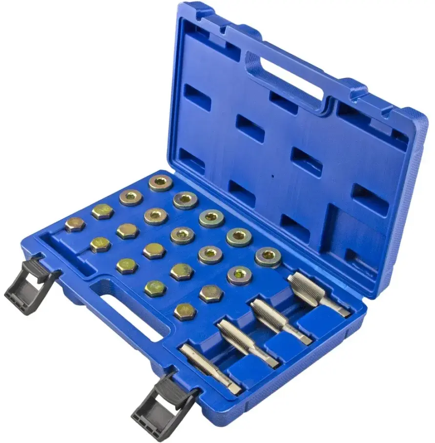 - Применение данного набора обеспечивает быстрое восстановление поврежденной резьбы при помощи специальных приспособлений.