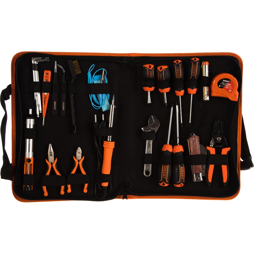 Набор электрика Gigant 27 предметов ELS27 представляет собой комплект инструментов, которые могут использоваться для спайки деталей, ремонта изделий под напряжением и т.д. Подходит для профессионального использования. Рабочие части выполнены из прочного и стойкого к нагрузкам материала. Набор поставляется в сумке для удобного хранения и транспортировки. Твердость стали соответствует 52 HRC.