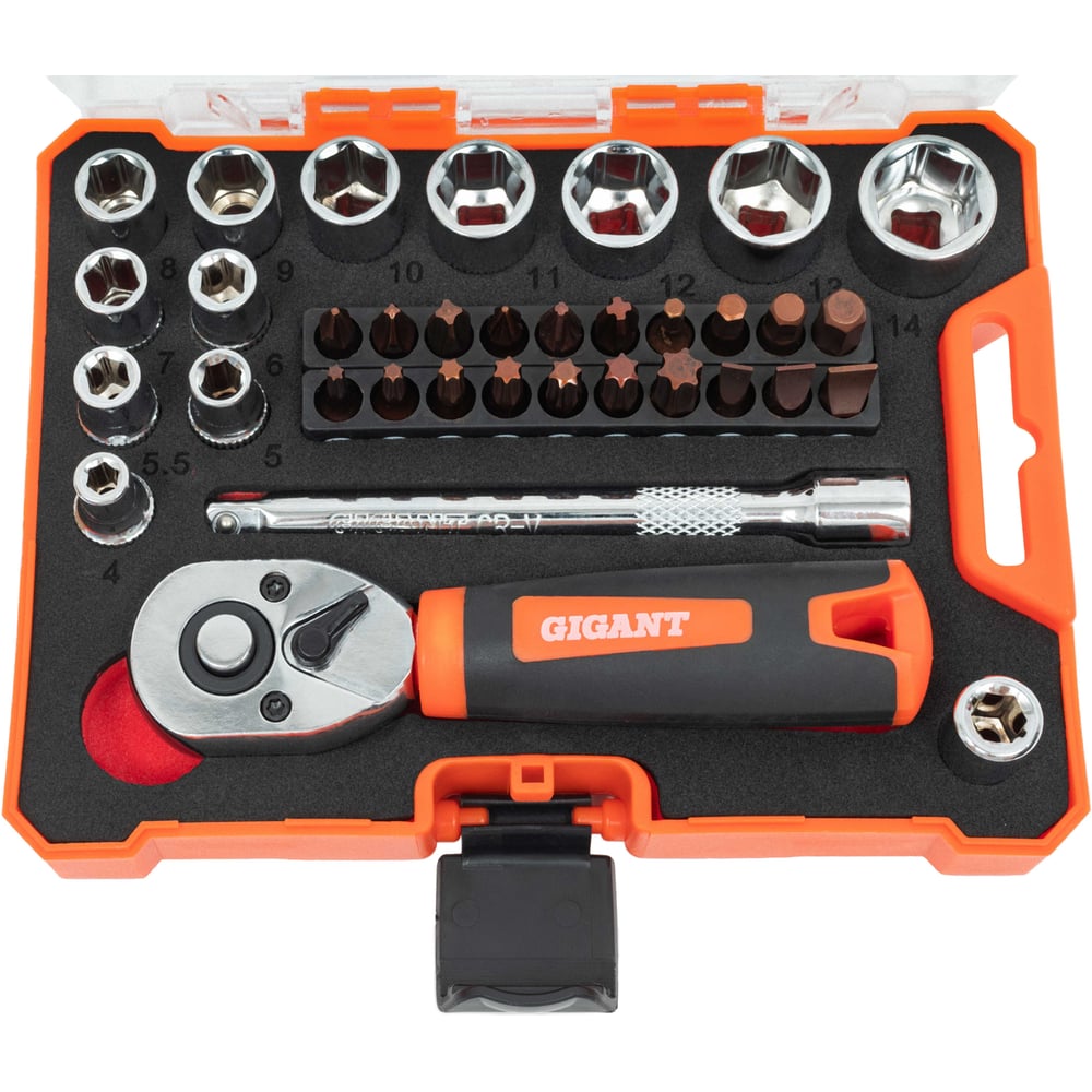 Набор Gigant: биты-20 шт, торцовые головки-12шт, трещотка 1/4-1шт, адаптер для бит SQ 1/4"хHex 1/4", удлинитель 1/4"/90мм GSBR-1/4