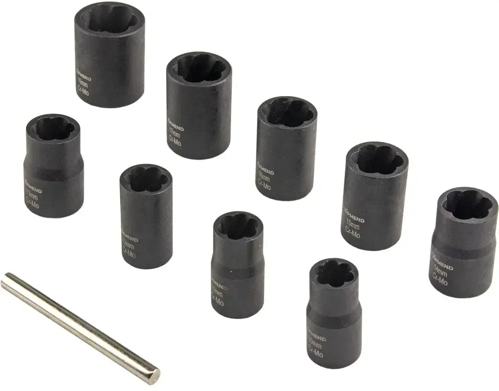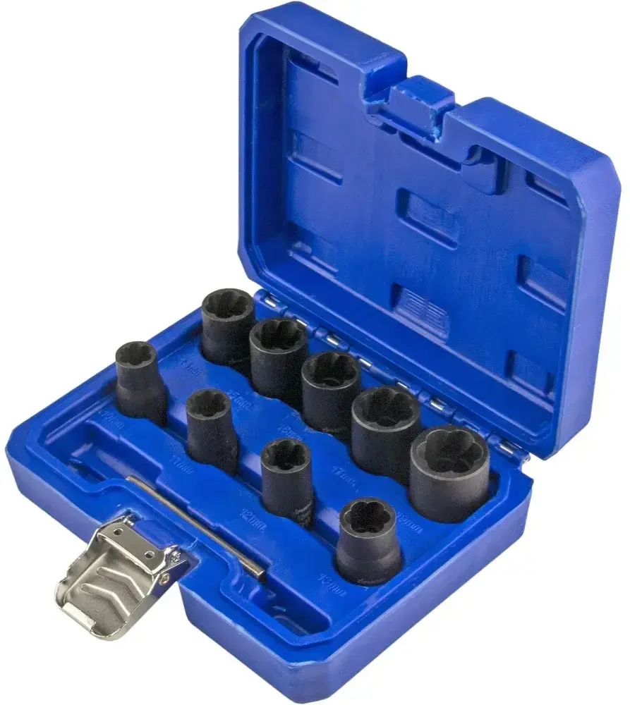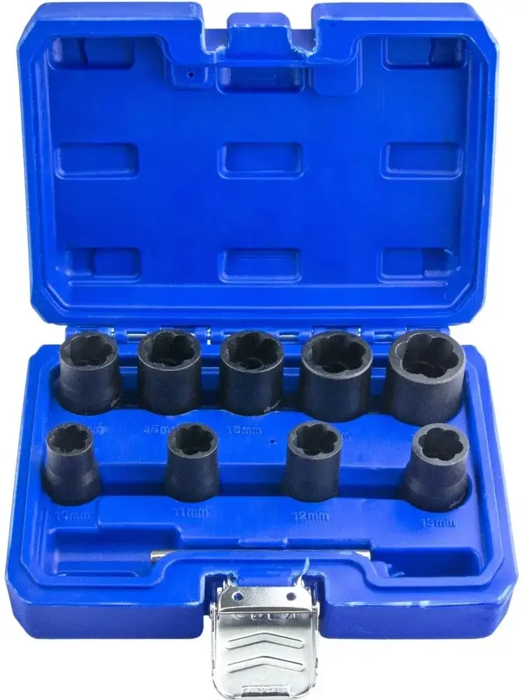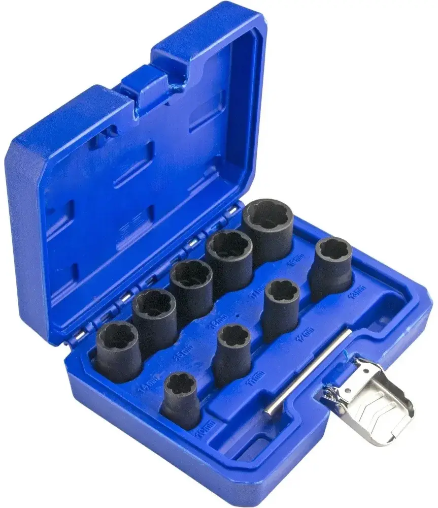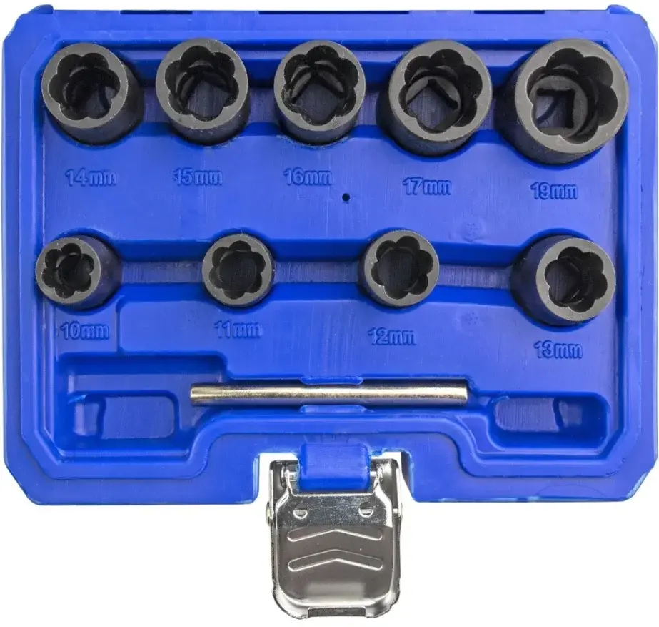 - Набор головок ZS-H041001 для поврежденных болтов и гаек, 3/8" 10 предметов (10-17, 19мм.), в кейсе удаляет поврежденные гайки, шпильки или болты, включая закругленные и ржавые колесные гайки.