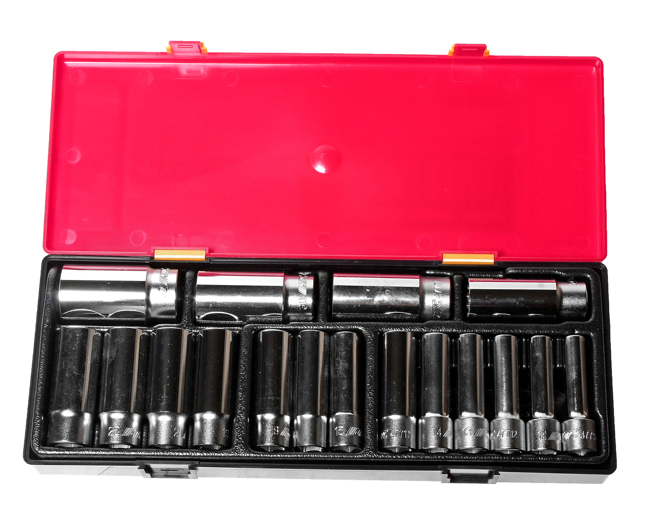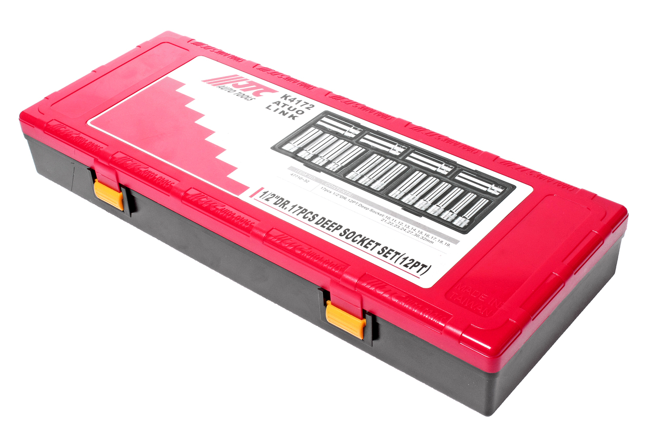 Артикулы JTC-47710-32: головки глубокие 12-гранные, 1/2": 10 мм.; 11 мм.; 12 мм.; 13 мм.; 14 мм.; 15 мм.; 16 мм.; 17 мм.; 18 мм.; 19 мм.; 21 мм.; 22 мм.; 23 мм.; 24 мм.; 27 мм.; 30 мм.; 32 мм. - 17 шт.
