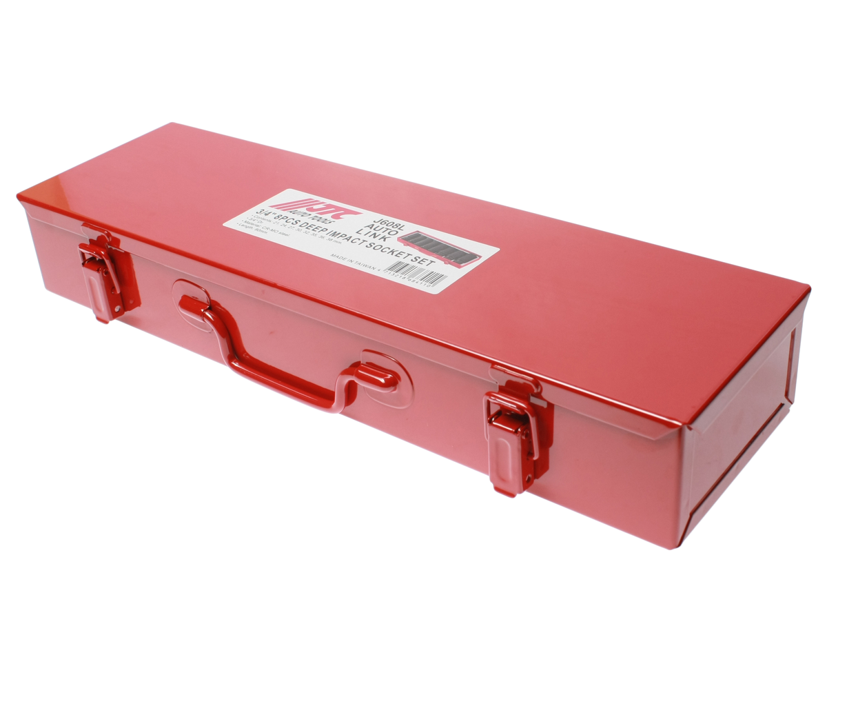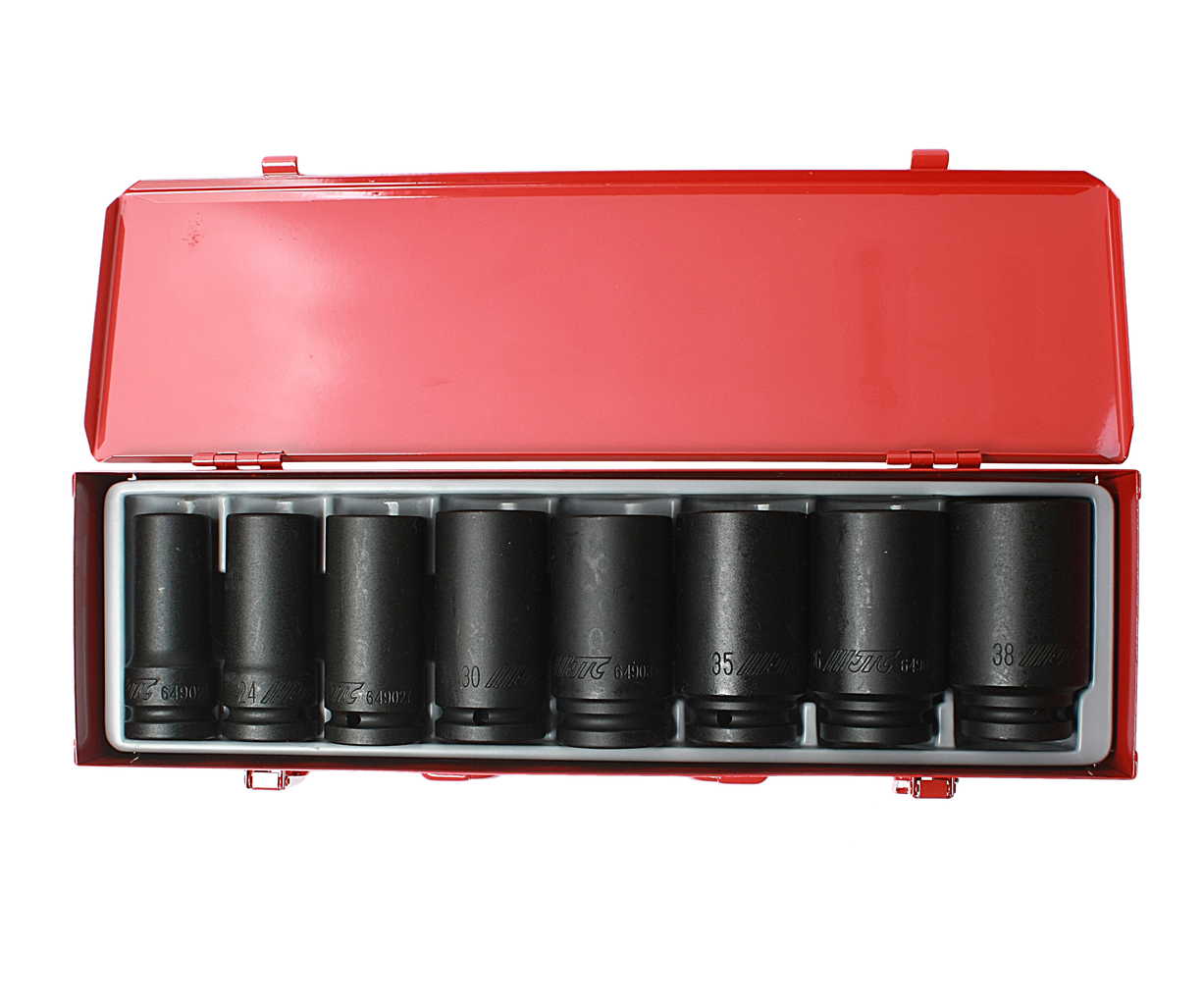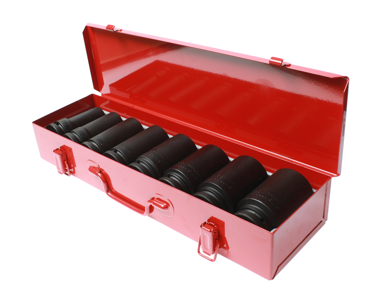 Набор глубоких ударных торцевых головок в металлическом кейсе.