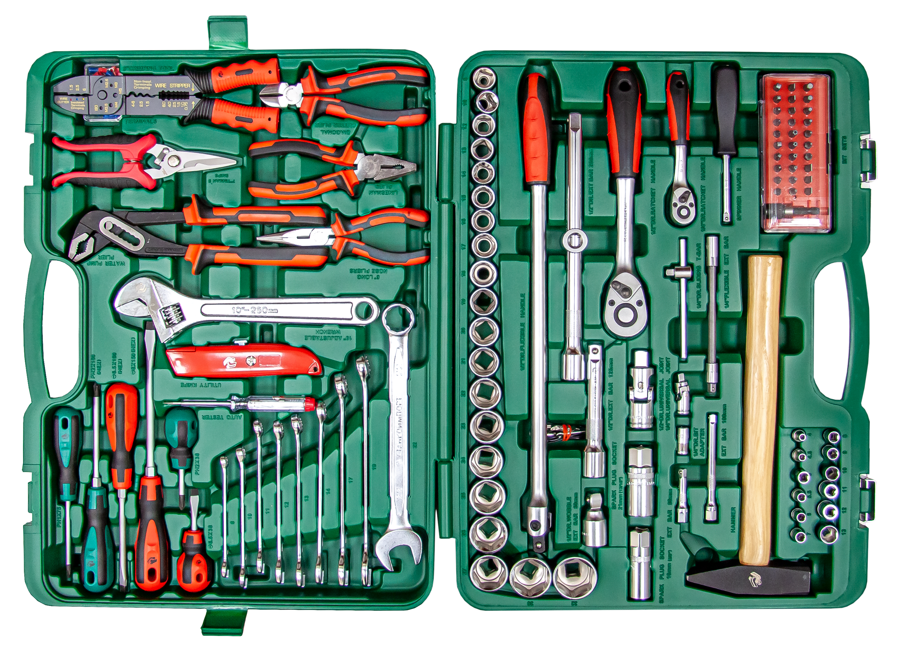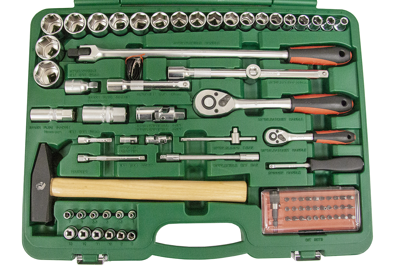 Назначение: В наборе собраны основные инструменты, необходимые при проведении большинства слесарно-монтажных работ. Таких как: демонтаж свечей, диагностика электрической цепи автомобиля, демонтаж узлов и агрегатов автомобиля, сборка/разборка мебели, монтаж/демонтаж запорной арматуры и т.д. Описание: Инструменты изготовливаются из хромванадиевой стали и проходят дополнительную микрофинишную полировку, что придает поверхности уникальный металлический блеск и премиальный вид. Рациональное размещение инструментов в кейсе обеспечивает удобство транспортировки и облегчает поиск необходимого инструмента. Сами инструменты расположены в индивидуальных подписанных ячейках, снабженных фиксаторами. Морозоустойчивый ударопрочный пластиковый кейс снабжен металлическими замками, выдерживающими многочисленные циклы открытия/закрытия. Кейс помещен в дизайнерскую упаковку, на которой отображена вся информация о наборе. Инструмент профессионального уровня, соответствует стандартам ГОСТ и DIN. Имеет высокий ресурс, позволяя не беспокоиться о покупке нового инструмента, взамен вышедшего из строя. Особенности: Равномерная обработка ключей не позволяет профилю изгибаться. Изогнутая рукоятка трещотки защищает пальцы от повреждений. Рукоятка молотка из дерева Гикори снижает до нуля отдачу при ударе. Механизм трещотки имеет 72 зуба и имеет шаг с точностью 5 градусов, что упрощает работу в труднодоступных местах. Комплектация: НаименованиеОписание торцевые головки 1/4"4, 4.5, 5, 5.5, 6-14 мм ключ трещоточный с быстрым сбросом 1/4" 72 зуба* отверточная рукоятка 1/4"150 мм вороток T-образный115 мм удлинители 1/4"50, 100 мм гибкий удлинитель 1/4"150 мм кардан шарнирный 1/4"40 мм битодержатель 1/4" х 1/4"25 мм набор бит 1/4": - шестигранные HEX1.5, 2, 2.5, 3, 4, 5, 6 мм - шлицевые SlotSL3, SL4, SL4.5, SL5, SL5.5, SL6, SL7 - крестовые PhilipsPH0, PH1, PH2, PH3, PH4 - крестовые PozidrivPZ0, PZ1, PZ2, PZ3, PZ4 - Torx BOTH10, TH15,TH20, TH25, TH27, TH30 держатель бит для меха­ни­зи­рованного привода 1/4"50 мм торцевые головки 1/2"8, 10, 12-27, 30, 32 мм ключ трещоточный с быстрым сбросом 1/2"72 зуба* удлинитель-вороток Т-образный 1/2"250 мм удлинитель Wobble 1/2"50 мм НаименованиеОписание удлинитель 1/2"125 мм ...