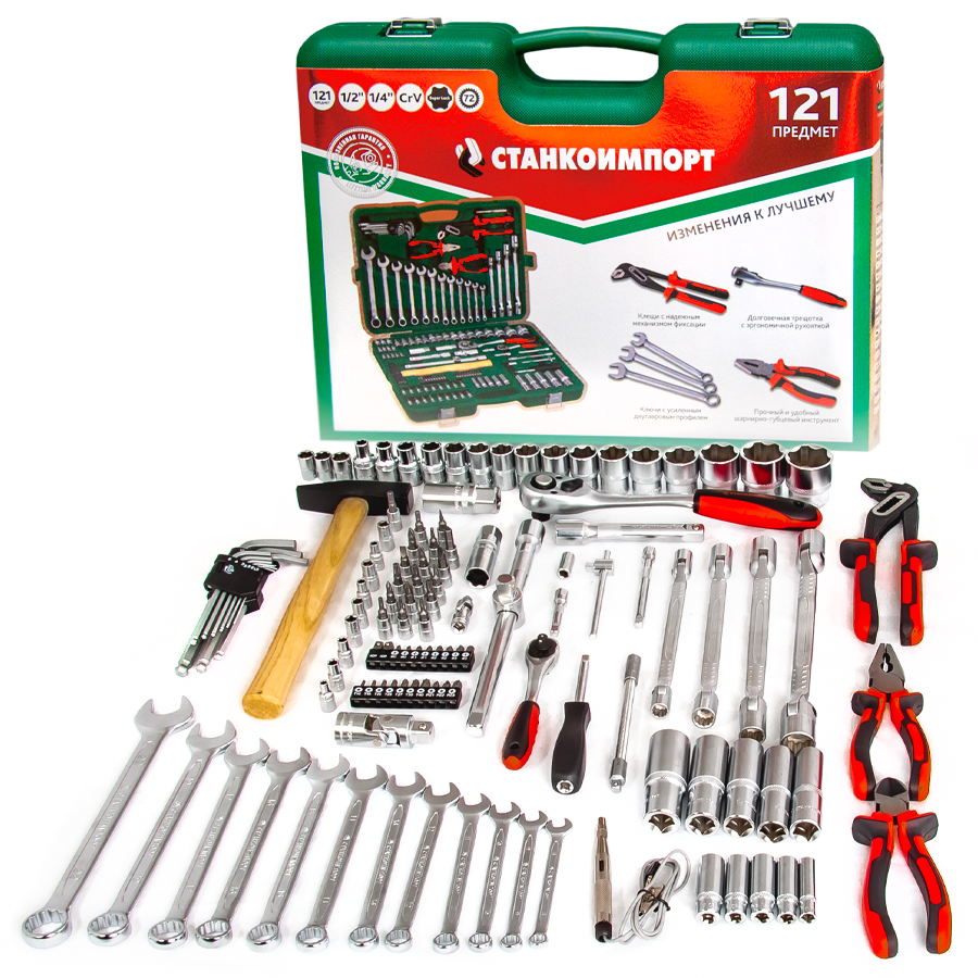 Назначение: В наборе собраны основные инструменты, необходимые при проведении большинства слесарно-монтажных работ в гараже, автосервисе. Описание: Инструменты изготовливаются из хромванадиевой стали и проходят дополнительную микрофинишную полировку, что придает поверхности уникальный металлический блеск и премиальный вид. Рациональное размещение инструментов в кейсе обеспечивает удобство транспортировки и облегчает поиск необходимого инструмента. Сами инструменты расположены в индивидуальных подписанных ячейках, снабженных фиксаторами. Морозоустойчивый ударопрочный пластиковый кейс снабжен металлическими замками, выдерживающими многочисленные циклы открытия/закрытия. Кейс помещен в дизайнерскую упаковку, на которой отображена вся информация о наборе. Инструмент профессионального уровня, соответствует стандартам ГОСТ и DIN. Имеет высокий ресурс, позволяя не беспокоиться о покупке нового инструмента, взамен вышедшего из строя. Особенности: Изогнутая рукоятка трещотки защищает пальцы от повреждений. Рукоятка молотка из дерева Гикори снижает до нуля отдачу при ударе. Механизм трещотки имеет 72 зуба и имеет шаг с точностью 5 градусов, что упрощает работу в труднодоступных местах. Комплектация: НаименованиеОписание торцевые головки 1/4"4, 4.5, 5, 5.5, 6-13 мм торцевые головки длинные 1/4"8, 10, 11, 12, 13 мм ключ трещоточный с быстрым сбросом 1/4" 72 зуба отверточная рукоятка 1/4"150 мм вороток T-образный 1/4"115 мм удлинители 1/4"50, 100 мм гибкий удлинитель 1/4"150 мм кардан шарнирный 1/4"40 мм торцевые головки со вставкой 1/4" - шестигранные HEX3, 4, 5, 6 мм - шлицевые SlotSL4, SL5.5, SL6.5 мм - крестовые PhilipsPH1, PH2 - крестовые PozidrivPZ1, PZ2 - TorxТ8, Т10, Т15, Т20, Т25, Т27, Т30 битодержатель 1/4" х 1/4"25 мм набор бит 1/4": - крестовые Philips (по 2 штуки)PH0, PH1, PH2, PH3 - крестовые PozidrivPZ1, PZ2, PZ3 НаименованиеОписание - TorxТ10, Т15, Т20, Т25, Т27, Т30, Т40 2 адаптера 1/4" НЕХх1/4"25 мм набор угловых шестигранных ключей1.5, 2, 2.5, 3, 4, 5, 6, 8, 10 мм торцевые головки 1/2"8, 10, 12-19, 21, 24, 27, 30, 32 мм торцевые головки длинные 1/2"14, 15, 17, 19, 22 мм ...