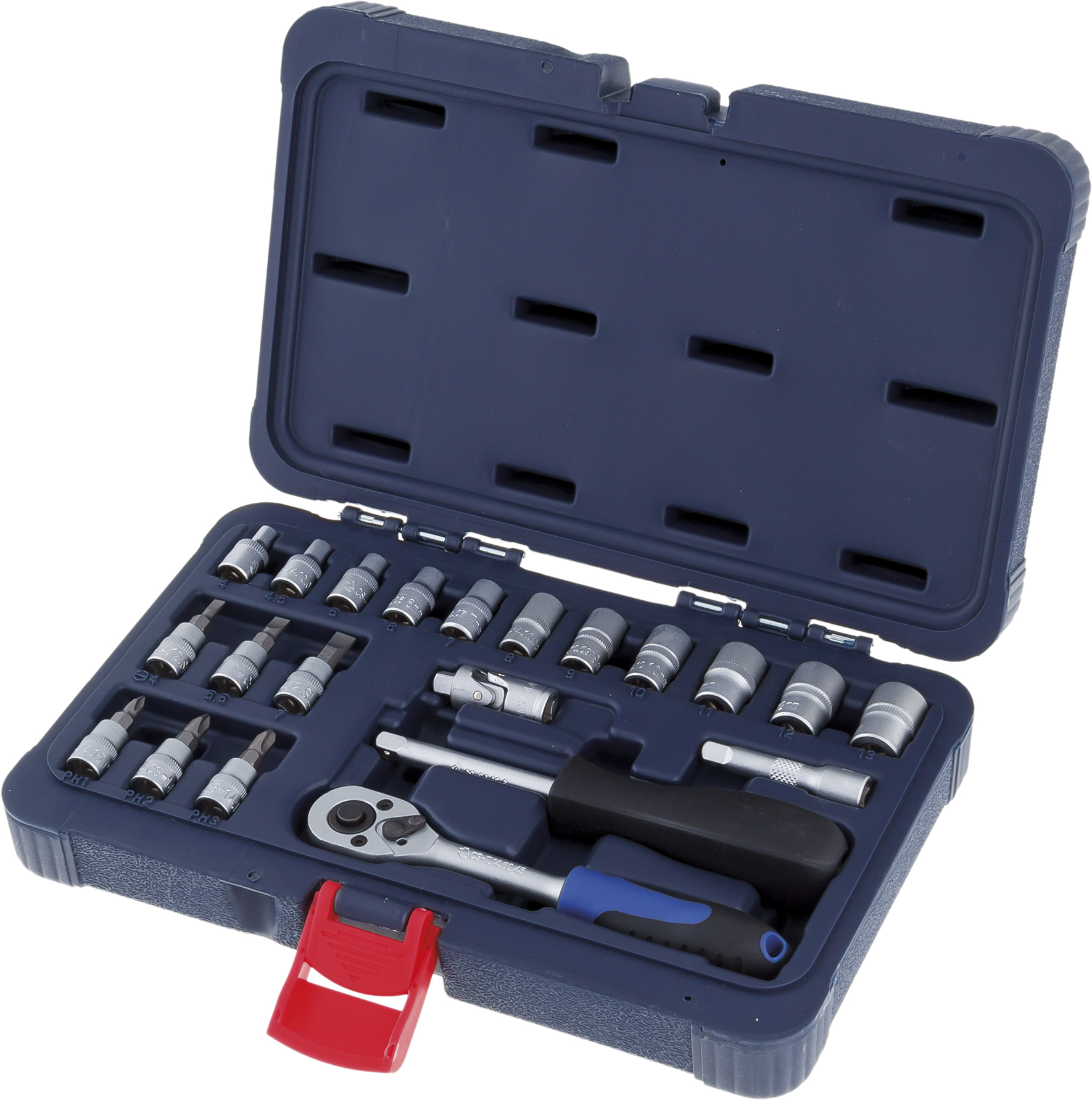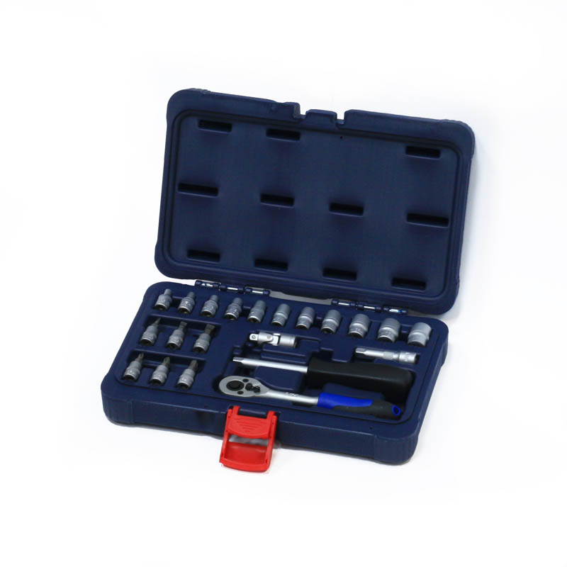 Набор инструментов 1/4" 22 предмета (пластиковый кейс) биты SLOTTED: 4, 5.5, 7мм биты PHILLIPS: №1, №2, №3 1/4" головки торцевые: 4, 4.5, 5, 6, 7, 8, 9, 10, 11, 12, 13мм 1/4" кардан шарнирный 1/4" ключ трещоточный с быстрым сбросом отвертка с квадратом 1/4" 1/4" удлинитель 50мм