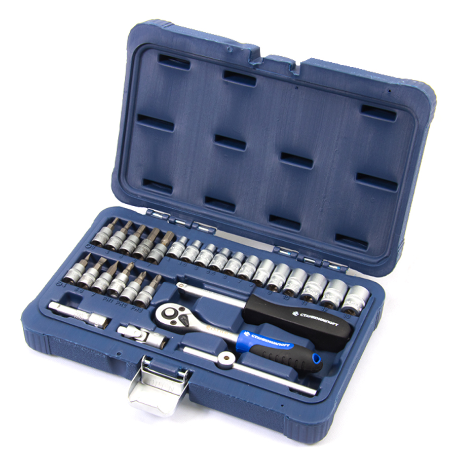 Набор инструментов 1/4" 28 предметов (пластиковый кейс) биты HEX: 3, 4, 5, 6, 7мм биты SLOTTED: 4, 5.5, 7мм биты PHILLIPS: №1, №2, №3 1/4" вороток Т-образный 1/4" головки торцевые: 4, 4.5, 5, 5.5, 6, 7, 8, 9, 10, 11, 12, 13мм 1/4" кардан шарнирный 1/4" ключ трещоточный с быстрым сбросом отвертка с квадратом 1/4" 1/4" удлинитель 50мм