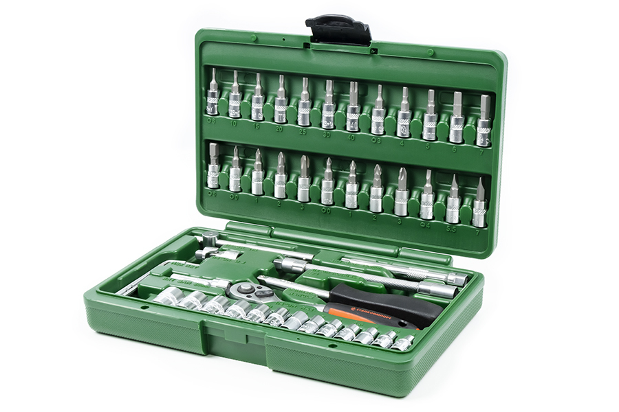 В наборе собраны инструменты, необходимые для слесарно-монтажных работ в гараже.