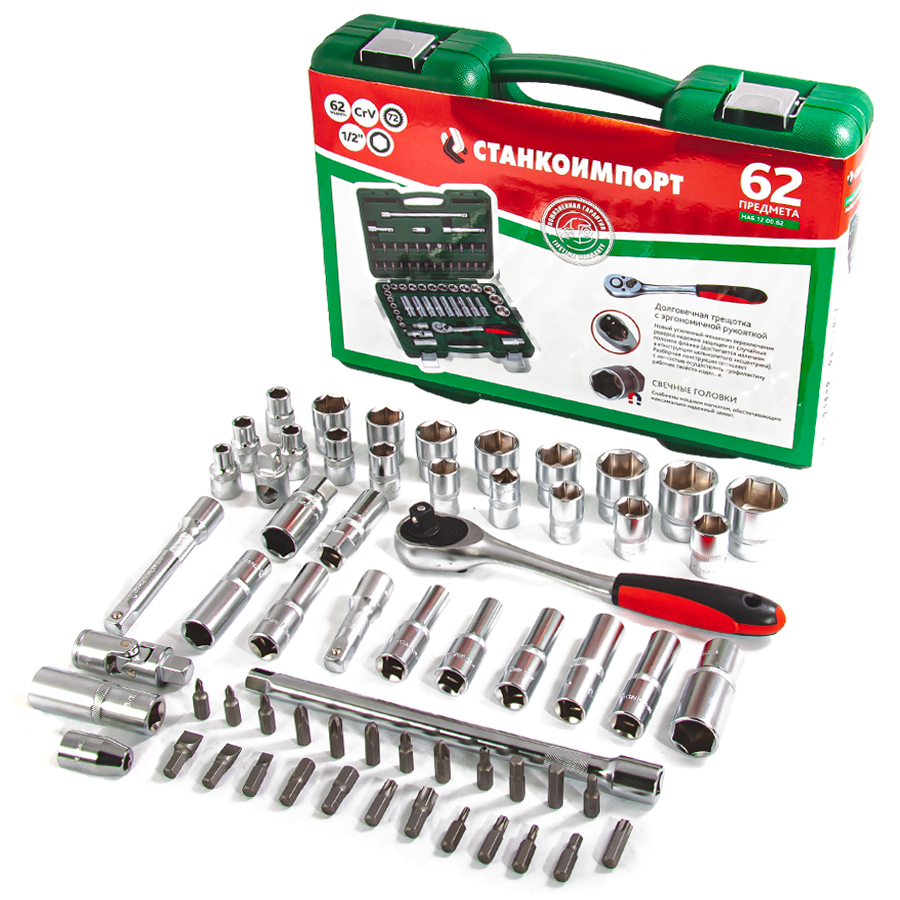 Назначение: В наборе собраны инструменты общего назначения, необходимые для слесарно-монтажных работ в гараже. Описание: Инструменты изготовливаются из хромванадиевой стали и проходят дополнительную микрофинишную полировку, что придает поверхности уникальный металлический блеск и премиальный вид. Рациональное размещение инструментов в кейсе обеспечивает удобство транспортировки и облегчает поиск необходимого инструмента. Сами инструменты расположены в индивидуальных подписанных ячейках, снабженных фиксаторами. Морозоустойчивый ударопрочный пластиковый кейс снабжен металлическими замками, выдерживающими многочисленные циклы открытия/закрытия. Кейс помещен в дизайнерскую упаковку, на которой отображена вся информация о наборе. Инструмент профессионального уровня, соответствует стандартам ГОСТ и DIN. Имеет высокий ресурс, позволяя не беспокоиться о покупке нового инструмента, взамен вышедшего из строя. Особенности: Изогнутая рукоятка трещотки защищает пальцы от повреждений. Механизм трещотки имеет 72 зуба и имеет шаг с точностью 5 градусов, что упрощает работу в труднодоступных местах. Комплектация: НаименованиеОписание торцевые головки 1/2"8, 10-24, 27, 30 ,32 мм торцевые головки длинные 1/2" 10-15, 17, 19, 22 мм ключ трещоточный с быстрым сбросом 1/2" 72 зуба удлинители 1/2"75, 125, 250 мм головки свечные 1/2"16, 21 мм кардан шарнирный 1/2"70 мм 3-сторонний адаптер 1/2"М х 3/8"F40 мм битодержатель 1/2"х 5/16"40 мм биты 5/16": - шестигранные HEX5, 6, 7, 8, 9, 10, 12 мм - шлицевые SlotSL7, SL10, SL12 - крестовые PhilipsPH1, PH2, PH3, PH4 - крестовые PozidrivPZ1, PZ2, PZ3, PZ4 - Torx BOTH20, TH25, TH30, TH40, TH45, TH50, TH55 Ограничения: Инструменты предназначены только для ручного применения. Не рекомендуется прикладывать чрезмерное усилие с помощью дополнительных рычагов, применять ударную нагрузку. Свечные головки нельзя ронять во избежание раскола неодимового магнита.