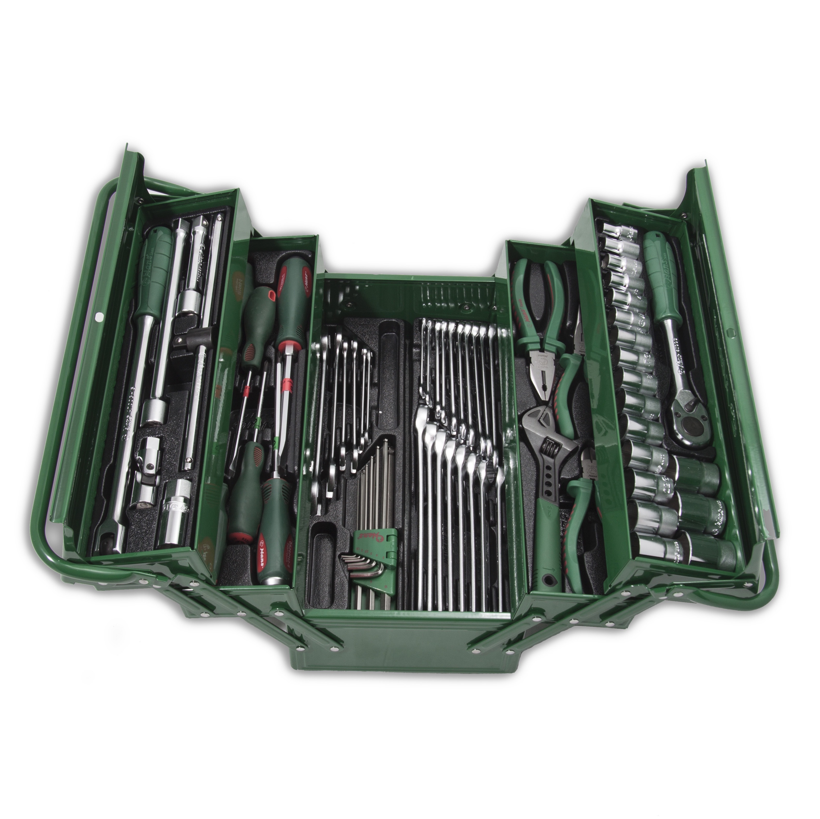 Набор инструментов TTBK-68G помещен в мобильный металлический кейс, который легко брать с собой. Благодаря высокофункциональной конструкции он занимает немного места в сложенном виде, а в разложенном – обеспечивает свободный доступ ко всем предметам, каждый из которых помещен в ячейку с фиксатором.