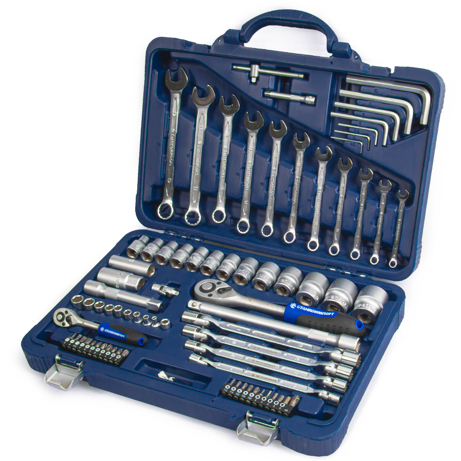 Назначение: В наборе собраны инструменты общего назначения, необходимые для работы в гараже и быту. Описание: Инструменты производятся из хромванадиевой стали. Ручки трещотки, шарнирно-губцевого инструмента, отверток изготовлены из маслобензостойкого материала. Рациональное размещение инструментов в кейсе обеспечивает удобство хранения и транспортировки. Сами инструменты расположены в индивидуальных подписанных ячейках, снабженных фиксаторами. Инструмент профессионального уровня, соответствует стандартам ГОСТ и DIN. Имеет высокий ресурс, позволяя не беспокоиться о покупке нового инструмента, взамен вышедшего из строя. Особенности: Головки имеют однородное высококачественное покрытие Soft Matt, обеспечивающее надежную защиту от царапин и коррозии. Снабжены специальными фрикционными насечками, предотвращающими выскальзывание из рук. Анатомическая двухкомпонентная рукоятка трещотки изготовлена из маслобензостойкого материала, что делает работу с инструментом комфортной. Соответствует немецким стандартам DIN и сохраняет работоспособность при превышении нагрузки на 70%. Комплектация: НаименованиеОписание торцевые головки 1/4"4-12 мм ключ трещоточный с быстрым сбросом 1/4"72 зуба вороток Т-образный 1/4"110 мм удлинитель 1/4"75 мм кардан шарнирный 1/4"40 мм битодержатель 1/4"х 1/4"25 мм биты 1/4": - шестигранные HEX 2, 3, 4, 5, 6 мм - шлицевые SlotSL3, SL4, SL5.5, SL7 - крестовые PhilipsPH0, PH1, PH2, PH3 - крестовые PozidrivPZ1, PZ2, PZ3 - TORXT10, T15, T20, T25, T30 адаптер 1/4"HEX х 1/4"25 мм торцевые головки 1/2"10-15, 17, 19, 22, 24, 27, 30, 32 мм ключ трещоточный с быстрым сбросом 1/2"72 зуба удлинители 1/2"125, 250 мм головки свечная 1/2"21 мм ключи комбинированные7-15, 17, 19 мм ключи шарнирные8х9, 10х11, 12х13, 14х15 мм угловые шестигранные ключи1.5, 2, 2.5, 5, 6, 8, 10 мм Ограничения: Инструменты предназначены только для ручного применения. Не рекомендуется прикладывать чрезмерное усилие с помощью дополнительных рычагов, применять ударную нагрузку.