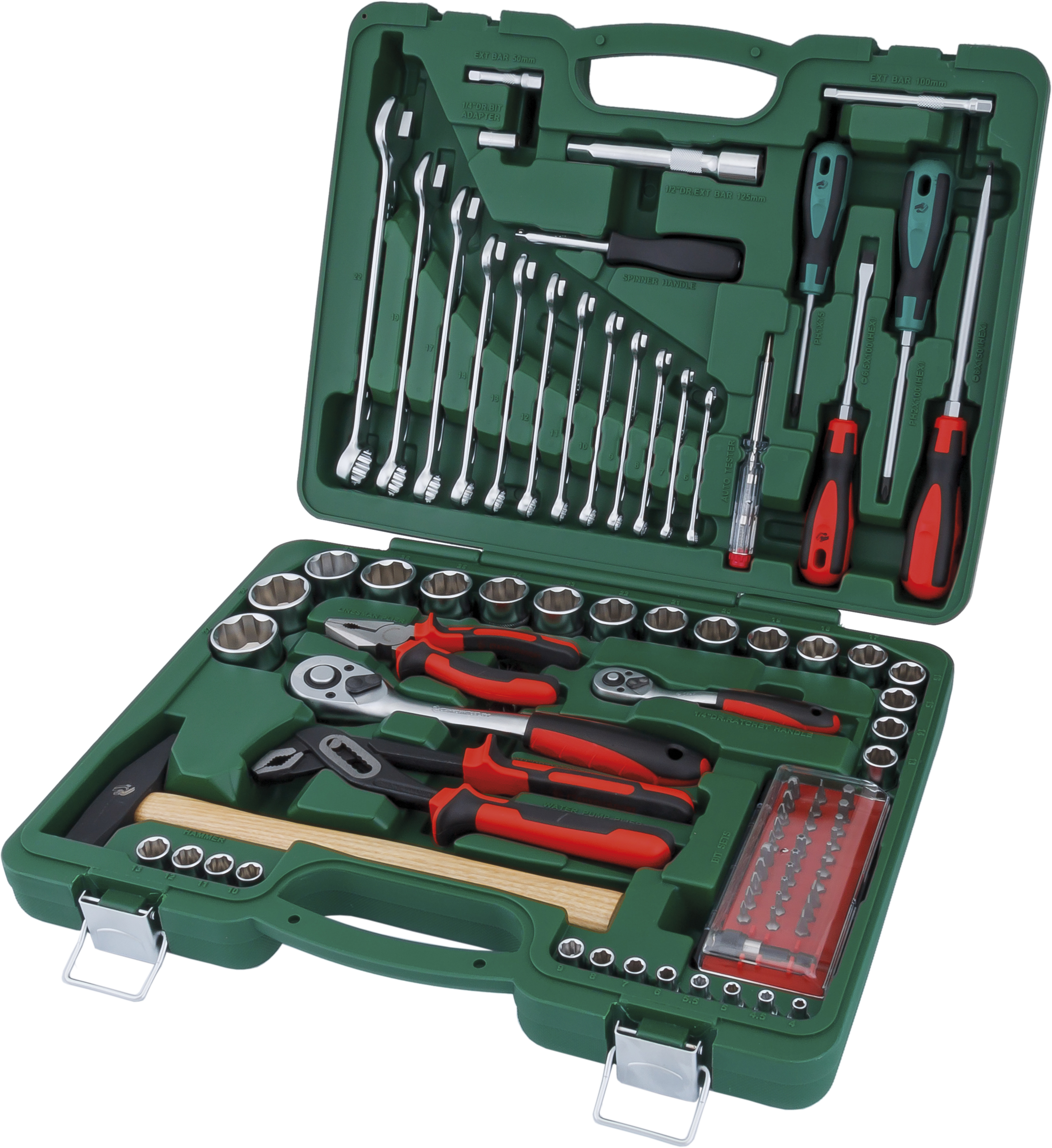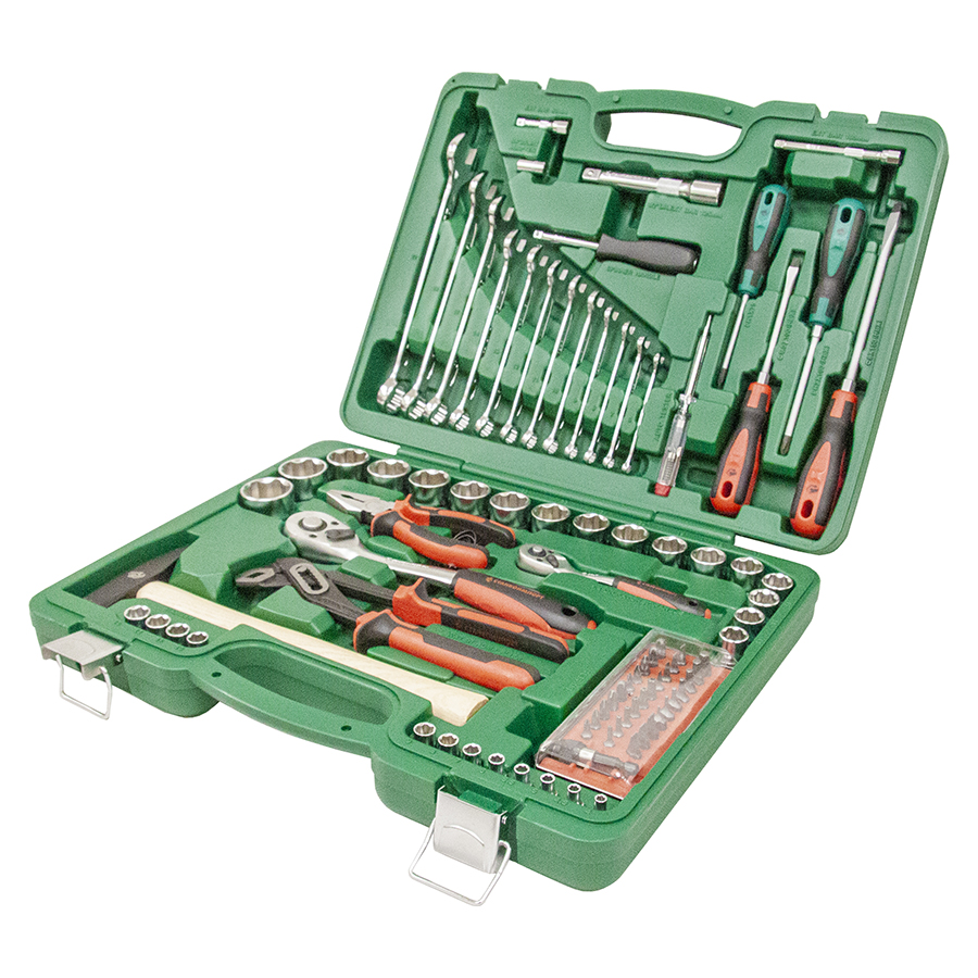 Назначение: В наборе собраны инструменты общего назначения, необходимыедля слесарно-монтажных работ в гараже. Описание: Инструменты изготовливаются из хромванадиевой стали и проходят дополнительную микрофинишную полировку, что придает поверхности уникальный металлический блеск и премиальный вид. Рациональное размещение инструментов в кейсе обеспечивает удобство транспортировки и облегчает поиск необходимого инструмента. Сами инструменты расположены в индивидуальных подписанных ячейках, снабженных фиксаторами. Морозоустойчивый ударопрочный пластиковый кейс снабжен металлическими замками, выдерживающими многочисленные циклы открытия/закрытия. Кейс помещен в дизайнерскую упаковку, на которой отображена вся информация о наборе. Инструмент профессионального уровня, соответствует стандартам ГОСТ и DIN. Имеет высокий ресурс, позволяя не беспокоиться о покупке нового инструмента, взамен вышедшего из строя. Особенности: Изогнутая рукоятка трещотки защищает пальцы от повреждений. Рукоятка молотка из дерева Гикори снижает до нуля отдачу при ударе. Механизм трещотки имеет 72 зуба и имеет шаг с точностью 5 градусов, что упрощает работу в труднодоступных местах. Комплектация: НаименованиеОписание торцевые головки 1/4"4, 4.5, 5, 5.5, 6-13 мм ключ трещоточный с быстрым сбросом 1/4" 72 зуба* отверточная рукоятка 1/4"150 мм удлинители 1/4"50, 100 мм битодержатель 1/4" х 1/4"25 мм набор бит 1/4": - шестигранные HEX1.5, 2, 2.5, 3, 4, 5, 6 мм - шлицевые SlotSL3, SL4, SL4.5, SL5, SL5.5, SL6, SL7 мм - крестовые PhilipsPH0, PH1, PH2, PH3, PH4 - крестовые PozidrivPZ0, PZ1, PZ2, PZ3, PZ4 - Torx BOTH10, TH15,TH20, TH25, TH27, TH30 держатель бит для меха­низи­рованного привода 1/4"50 мм НаименованиеОписание торцевые головки 1/2"13-27, 30, 32 мм ключ трещоточный с быстрым сбросом 1/2"72 зуба удлинитель 1/2"125 мм ключи комбинированные6-14, 17, 19, 22 мм отвертки: - шлицевые Slot6.5x100, 8x150 мм - крестовые PhilipsPH1x75, PH2x100 мм клещи переставные10"/250 мм пассатижи6"/160 мм индикатор напряжения автомобильный6V-12V-24V молоток с ручкой из дерева гикори300 г ...