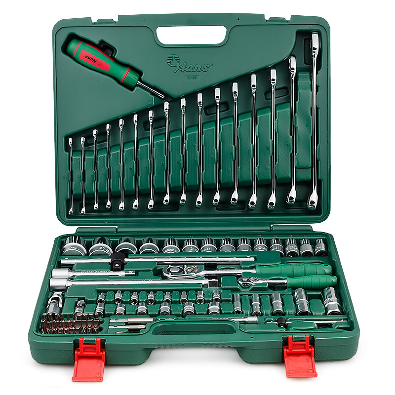 Набор инструментов TK-95 от HANS будет полезен Вам при осуществлении работ по ремонту автомобиля. Широкий размерный ряд различных торцевых головок и бит, входящих в его комплектацию, дает уверенность в том, что у вас под рукой всегда будет инструмент для работы с любым крепежом.