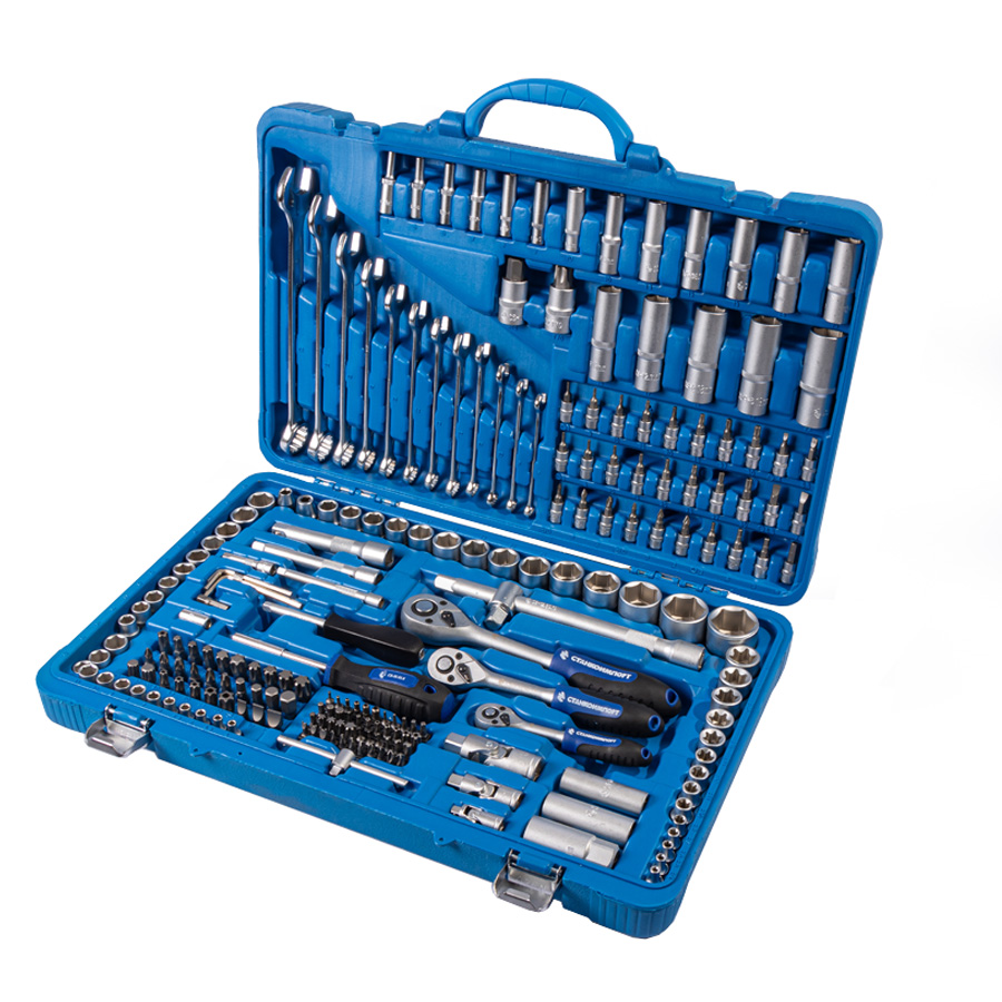 Назначение: В наборе собраны инструменты общего назначения, необходимые для работы в гараже, мастерских и автосервисах. Описание: Инструменты производятся из хромванадиевой стали. Ручки трещотки, шарнирно-губцевого инструмента, отверток изготовлены из маслобензостойкого материала. Рациональное размещение инструментов в кейсе обеспечивает удобство хранения и транспортировки. Сами инструменты расположены в индивидуальных подписанных ячейках, снабженных фиксаторами. Инструмент профессионального уровня, соответствует стандартам ГОСТ и DIN. Имеет высокий ресурс, позволяя не беспокоиться о покупке нового инструмента, взамен вышедшего из строя. Особенности: Головки имеют однородное высококачественное покрытие Soft Matt, обеспечивающие надежную защиту от царапин и коррозии. Снабжены специальными фрикционными насечками, предотвращающими выскальзывание из рук. Анатомическая двухкомпонентная рукоятка трещотки изготовлена из маслобензостойкого материала, что делает работу с инструментом комфортной. Соответствует немецким стандартам DIN и сохраняет работоспособность при превышении нагрузки на 70%. Комплектация: НаименованиеОписание торцевые головки 1/4"4, 4.5, 5, 5.5, 6-14 мм торцевые головки длинные 1/4"4-10 мм торцевые головки E-Star 1/4"Е4, Е5, Е6, Е7, Е8 ключ трещоточный с быстрым сбросом 1/4" 72 зуба отверточная рукоятка 1/4"150 мм вороток Т-образный 1/4"110 мм удлинители 1/4"50, 100 мм кардан шарнирный 1/4"40 мм торцевые головки со вставкой 1/4": - шестигранные HEX3, 4, 5, 6 мм - шлицевые SlotSL4, SL5.5, SL6.5, SL7 - крестовые PhilipsPH0, PH1, PH2 - крестовые PozidrivPZ0, PZ1, PZ2 - TorxТ8, Т9, T10, T15, T20, T25, T27, T30 - Torx BOТH8, ТH9, TH10, TH15, TH20, TH25, TH27, TH30 битодержатель 1/4"х 1/4"25 мм отвертка для бит с магнитом 1/4"200 мм биты 1/4": - шестигранные HEX BO2, 2.5, 3, 4, 5, 6 мм - TorxТ5, T6 - Torx BOTH7 - KeywayM5, M6, M7, M8, M9 - Much ToothM5, M6, M8 - Five StarТS10, ТS15, TS20, TS25, TS27, TS30, TS40, TS46 - Square0, 1, 2, 3 - Spanner6, 8, 10 - Torq4, 6, 8, 11 -Butterfly1, 2, 3 ...