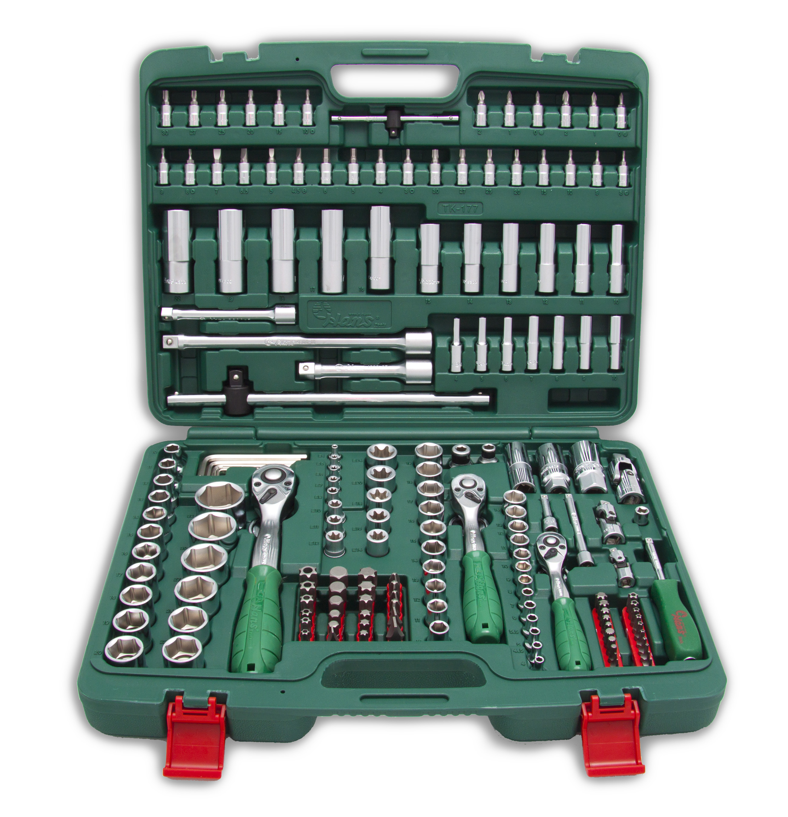 Набор инструментов TK-177 включает в себя 177 предметов с посадочными квадратами 1/2", ¼" и 3/8". Материалом, из которого они изготовлены, является качественная хромванадиевая сталь, которая отличается прочностью, долговечностью и износостойкостью.