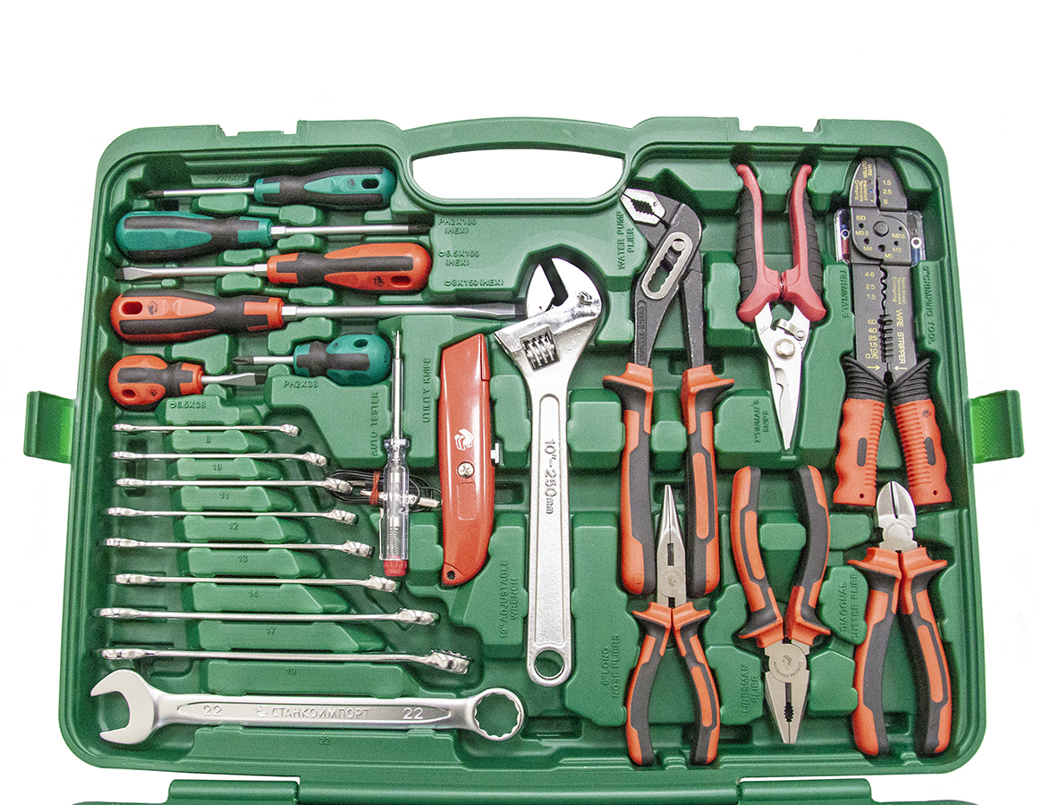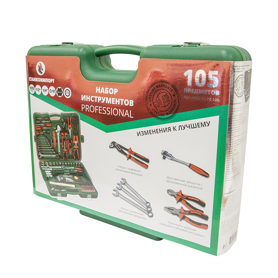 Назначение: В наборе собраны основные инструменты, необходимые при проведении большинства слесарно-монтажных работ. Таких как: демонтаж свечей, диагностика электрической цепи автомобиля, демонтаж узлов и агрегатов автомобиля, сборка/разборка мебели, монтаж/демонтаж запорной арматуры и т.д. Описание: Инструменты изготовливаются из хромванадиевой стали и проходят дополнительную микрофинишную полировку, что придает поверхности уникальный металлический блеск и премиальный вид. Рациональное размещение инструментов в кейсе обеспечивает удобство транспортировки и облегчает поиск необходимого инструмента. Сами инструменты расположены в индивидуальных подписанных ячейках, снабженных фиксаторами. Морозоустойчивый ударопрочный пластиковый кейс снабжен металлическими замками, выдерживающими многочисленные циклы открытия/закрытия. Кейс помещен в дизайнерскую упаковку, на которой отображена вся информация о наборе. Инструмент профессионального уровня, соответствует стандартам ГОСТ и DIN. Имеет высокий ресурс, позволяя не беспокоиться о покупке нового инструмента, взамен вышедшего из строя. Особенности: Равномерная обработка ключей не позволяет профилю изгибаться. Изогнутая рукоятка трещотки защищает пальцы от повреждений. Рукоятка молотка из дерева Гикори снижает до нуля отдачу при ударе. Механизм трещотки имеет 72 зуба и имеет шаг с точностью 5 градусов, что упрощает работу в труднодоступных местах. Комплектация: НаименованиеОписание торцевые головки 1/4"4, 4.5, 5, 5.5, 6-14 мм ключ трещоточный с быстрым сбросом 1/4" 72 зуба отверточная рукоятка карданная с битодержателем 1/4"200 мм вороток T-образный115 мм удлинители 1/4"50, 100 мм кардан шарнирный 1/4"40 мм битодержатель 1/4" х 1/4"25 мм набор бит 1/4": - шестигранные HEX1.5, 2, 2.5, 3, 4, 5, 6 мм - шлицевые SlotSL3, SL4, SL4.5, SL5, SL5.5, SL6, SL7 мм - крестовые PhilipsPH0, PH1, PH2, PH3, PH4 - крестовые PozidrivPZ0, PZ1, PZ2, PZ3, PZ4 - Torx BOTH10, TH15,TH20, TH25, TH27, TH30 держатель бит для механизированного привода 1/4"50 мм набор шестигранных угловых ключей1.5, 2, 2.5, 3, 4, 5, 6, 8,10 мм торцевые головки 1/2"12, 13, 14, 15, 16, 17, 18, 19, 22, 24, 27, 30, 32 мм ключ трещоточный с быстрым сбросом 1/2"72 зуба удлинитель-вороток Т-образный 1/2"250 мм удлинитель 1/2"125 мм ...