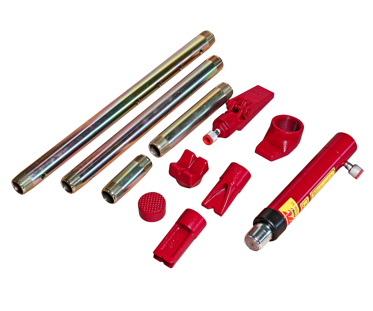 Набор гидравлического инструмента представляет собой компактный и удобный в эксплуатации комплект из гидравлического насоса (1) и гидравлического цилиндра (3), с помощью которых создается рабочее усилие; удлинителей для упрощения работы (5-8); специальных фигурных соединяющих насадок (11-16), для надежного упора в детали кузова.