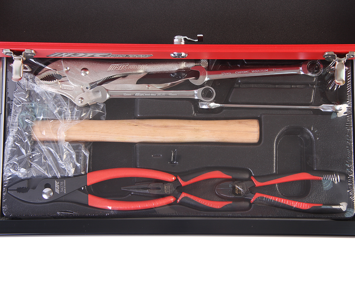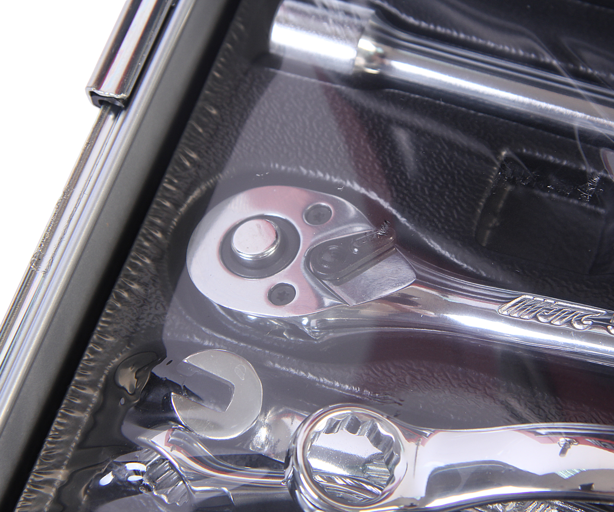 В набор входят молоток, струбцина, отвертки разных размеров (38-150 мм), трещотка (посадочный квадрат 3/8"), биты, головки 8-22, магнитный свечной ключ 14, 16, 21.