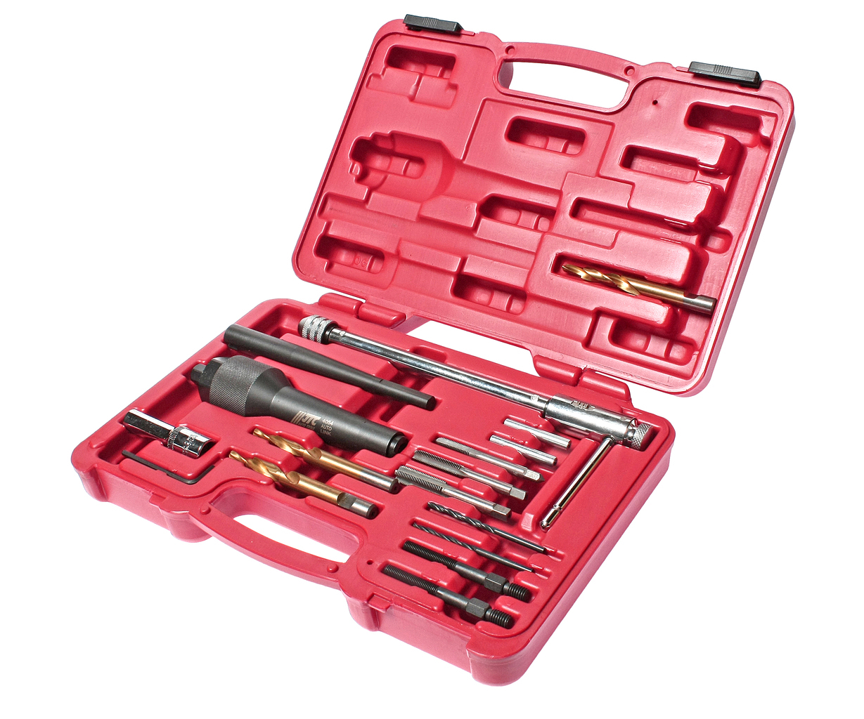 Набор профессионального инструмента для извлечения свечей накаливания и восстановления резьбы в их колодцах, а также для высверливания шпилек, болтов, свечей зажигания.