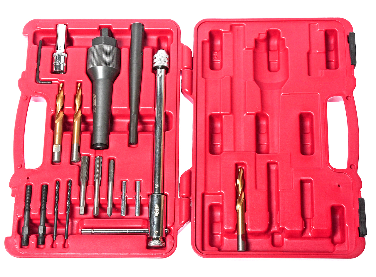 В набор входят сверла различного диаметра, втулки, конусы, а также метчики для восстановления резьбы.