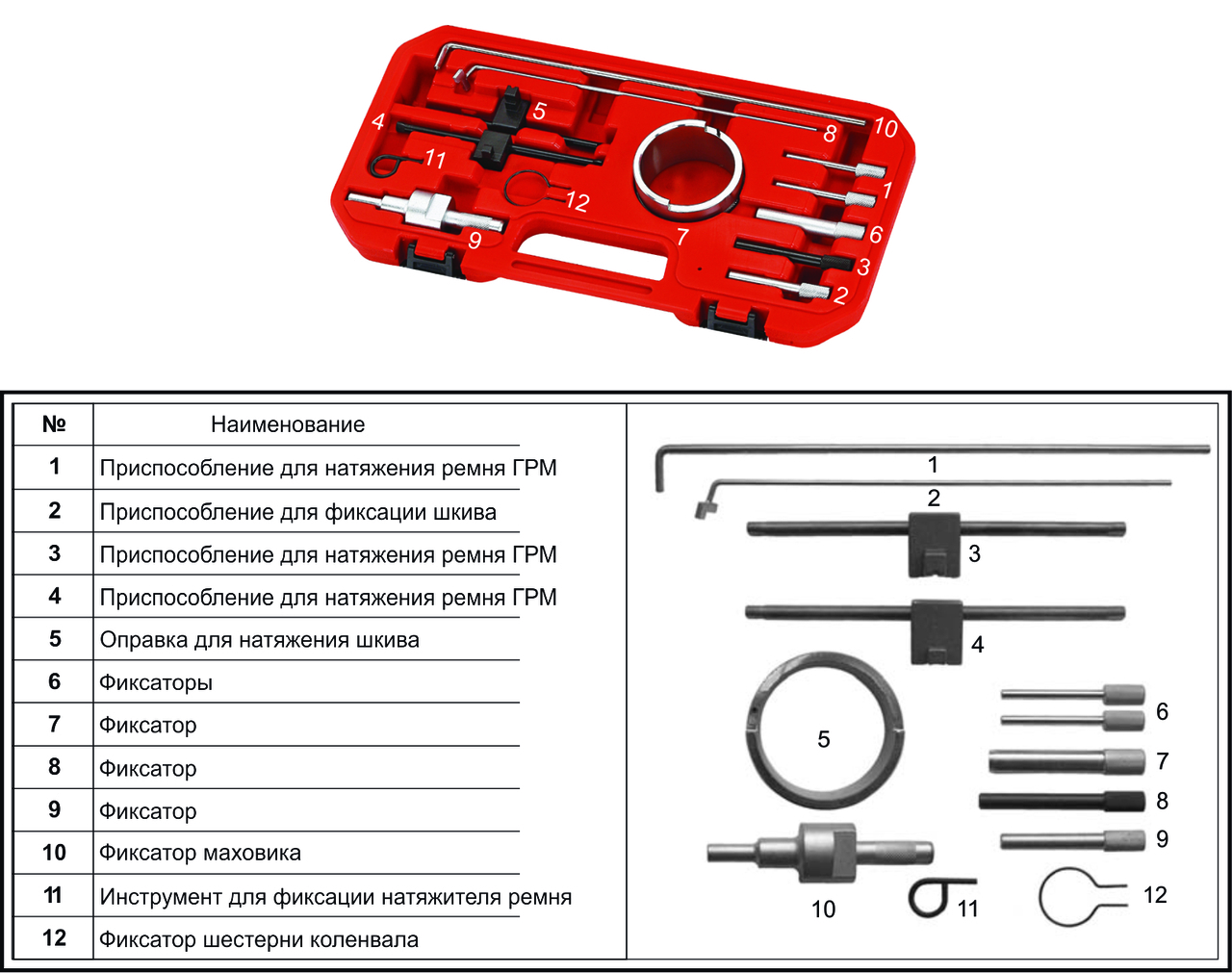 Данный комплект фиксаторов позволяет проводить корректную установку фаз ГРМ двигателя во время замены приводного ремня.