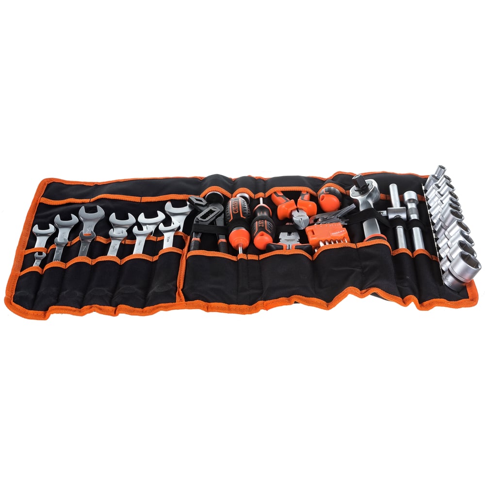 Набор представлен в оптимальной комплектации и включает в себя самые необходимые инструменты и популярные типоразмеры головок и ключей. Это делает данный набор универсальным и незаменимым помощником для выполнения ремонтных работ в гараже и дома. Рабочие части инструмента изготовлены из прочной стали и отличаются высокой стойкостью к износу. Антикоррозийное покрытие надежно защищает инструмент от негативного внешнего воздействия и значительно продлевает его срок службы. Набор поставляется в удобной компактной сумке, где каждый предмет имеет свое отделение. Это обеспечивает бережное хранение, комфортную транспортировку и удобный поиск необходимой модели во время работы.
