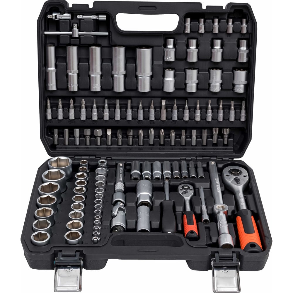 Набор инструментов Gigant DIY 108 предметов GDAS-108 - это качественный профессиональный комплект инструментов для автомобиля. В комплекте набора 108 предметов. В него входят торцевые головки удлиненные и с наконечником, имбусовые ключи, трещотки, насадки биты, вороток Т-образный, отвертка-вороток и многое другое. Некоторые из деталей идут в разных размерах, чтобы все нужные инструменты всегда были под рукой. Предметы набора отличаются долговечностью и высокой прочностью, так как изготовлены из закаленной стали и защищены от коррозии. А прорезиненная рукоятка будет комфортно лежать в руке и не выскользнет. Трещоточный ключ на 72 зубца имеет шариковый замок для надежного удержания и изогнутую форму для работы в удаленных местах. Флажковый переключатель реверса и насечки на головках обеспечивают свободное вращение ключа. Торцевые головки подходят для откручивания и закручивания болтов. 6-гранные свечные головки делают фиксацию более крепкой и надежной. Комплект поставляется в ударопрочном кейсе. Все инструменты в нем надежно закреплены.