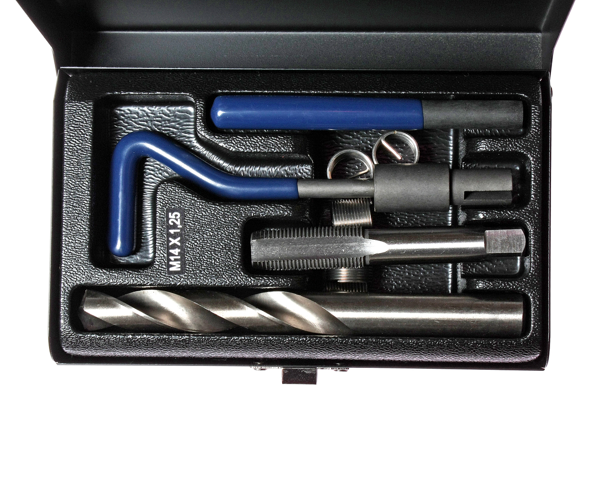 В комплект входят: сверло, метчик, установочный инструмент, инструмент для обламывания хвостовика, резьбовые вставки