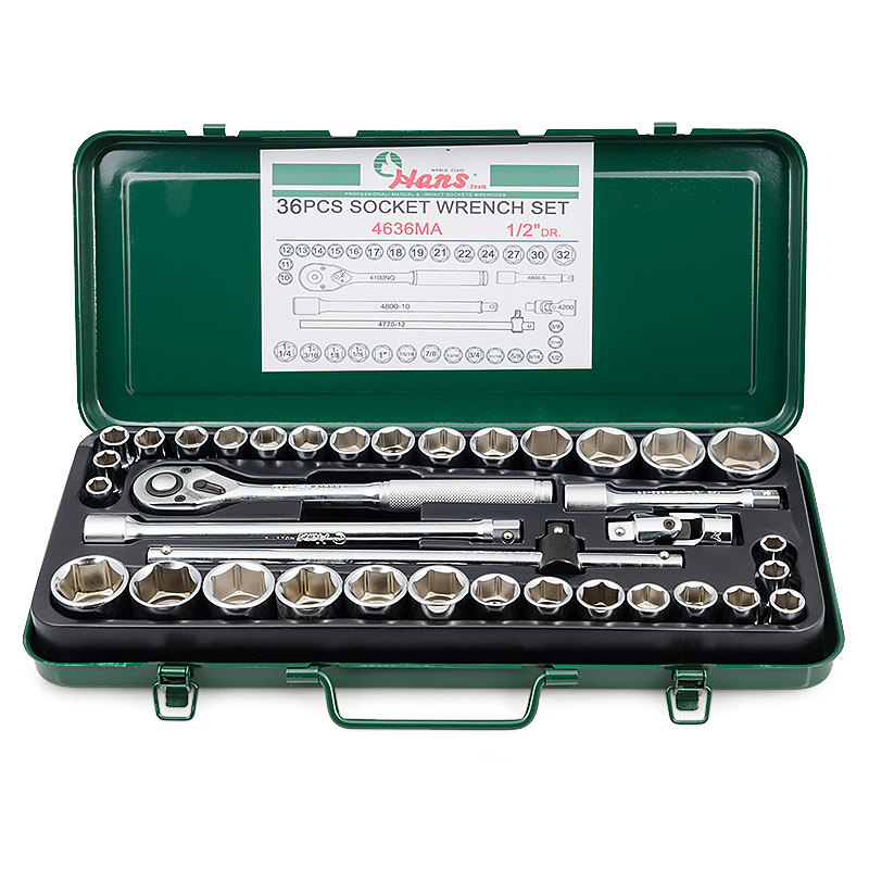 Набор инструментов на 1/2, 36 предметов. Головки торцевые: 10,11,12,13,14,15,16,17,18,19,21,22,24, 27,30,32 3/8,7/16,1/2,9/16,5/8,11/16,3/4,13/16,7/8,15/16,1",1-1/16, 1-1/8,1-3/16,1-1/4 Трещотка с быстрым сбросом 250 мм/10" Шарнир карданный 70 мм/2-3/4" Вороток Т-образный 300 мм/12" Удлинитель 125, 250 мм/5", 10"