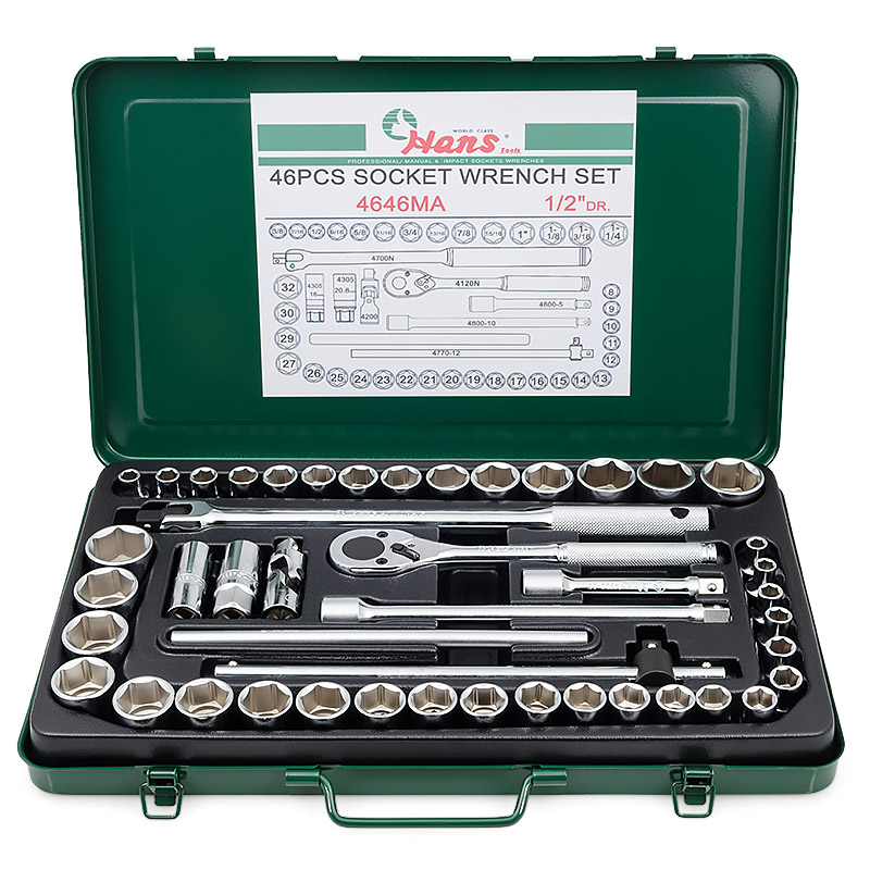 Набор инструментов на 1/2, 46 предметов. Головки торцевые: 8,9,10,11,12,13,14,15,16,17,18,19,20,21,22, 24,25,26,27,29 30,32 мм 22 PCS MM 3/8,7/16,1/2,9/16,5/8,11/16,3/4,13/16,7/8,15/16,1",1-1/16, 1-1/8,1-3/16,1-1/4 Вороток шарнирный 380 мм/15" Шарнир карданный 70 мм/2-3/4" Свечная головка 16,20.8мм Вороток шарнирный 380 мм/15" Т-образный вороток 250 мм Вороток Т-образный 300 мм/12" Удлинитель 125,250 мм/5",10"