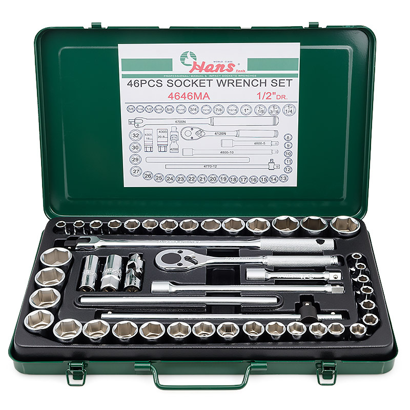 Набор инструментов на 1/2, 46 предметов. Головки торцевые: 8,9,10,11,12,13,14,15,16,17,18,19,20,21,22, 24,25,26,27,29 30,32 мм 22 PCS MM 3/8,7/16,1/2,9/16,5/8,11/16,3/4,13/16,7/8,15/16,1',1-1/16, 1-1/8,1-3/16,1-1/4 Вороток шарнирный 380 мм/15' Шарнир карданный 70 мм/2-3/4' Свечная головка 16,20.8мм Вороток шарнирный 380 мм/15' Т-образный вороток 250 мм Вороток Т-образный 300 мм/12' Удлинитель 125,250 мм/5',10'
