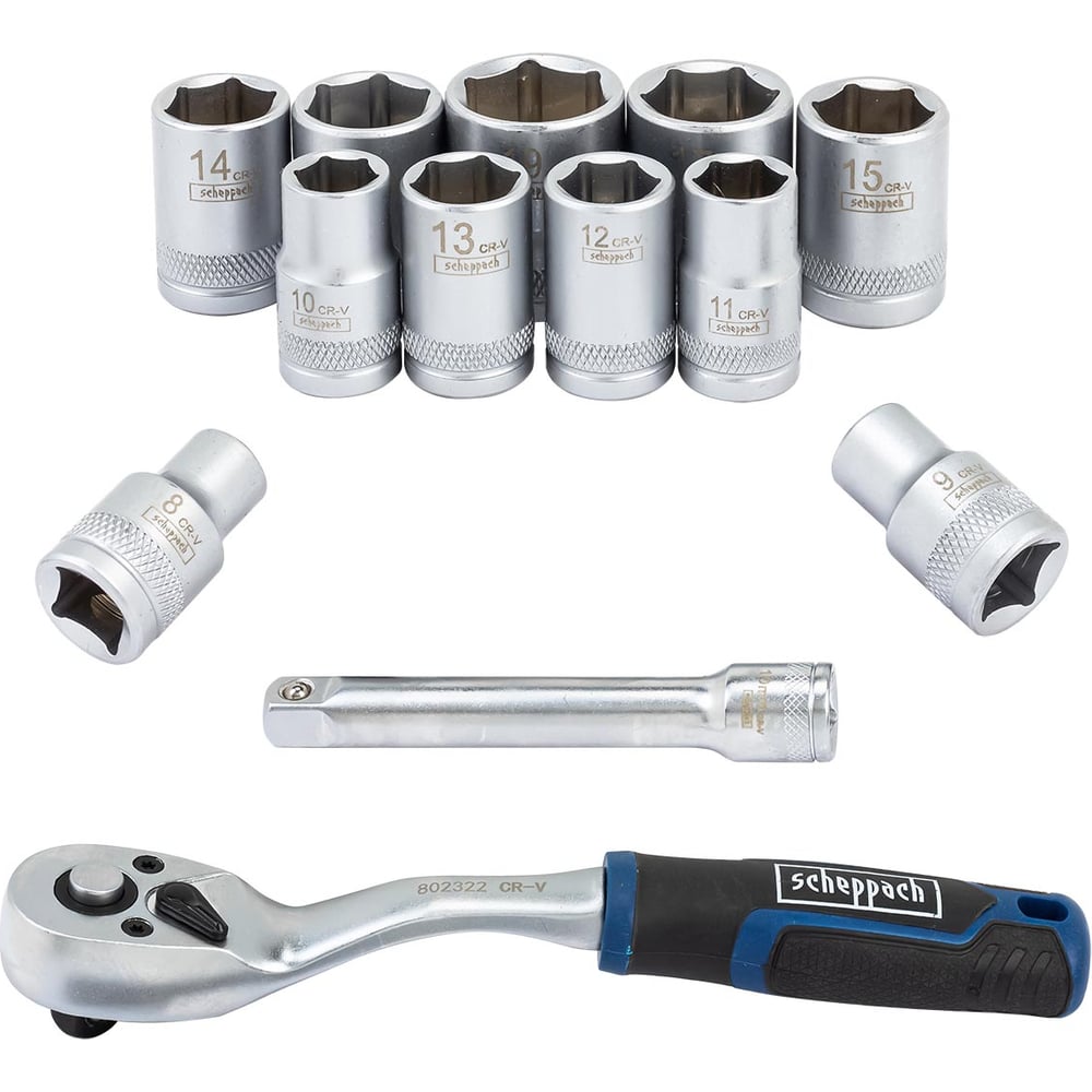 Компактный и универсальный набор от бренда Scheppach, включающий 13 предметов, идеально подходит для бытового и полупрофессионального использования. Все элементы выполнены из прочной хромованадиевой стали, обеспечивающей долговечность и устойчивость к коррозии. Упакован в удобный пластиковый держатель, который легко помещается в ящик, сумку или багажник автомобиля.ПреимуществаПолный набор головок Включает 11 шестигранных головок от 8 до 19 мм — охватывает широкий диапазон типоразмеров для работы с крепежом.Трещотка с реверсом Удобная трещотка 3/8" длиной 195 мм позволяет быстро закручивать и откручивать крепёж без снятия инструмента.Шариковый фиксатор Удлинитель 100 мм с шариковым фиксатором обеспечивает надёжную фиксацию головок и комфорт при работе в труднодоступных местах.Удобная упаковка Пластиковый держатель компактно организует все элементы, облегчая хранение и транспортировку.Прочный материал Все инструменты изготовлены из стали Cr-V — это гарантия надёжности и устойчивости к износу.