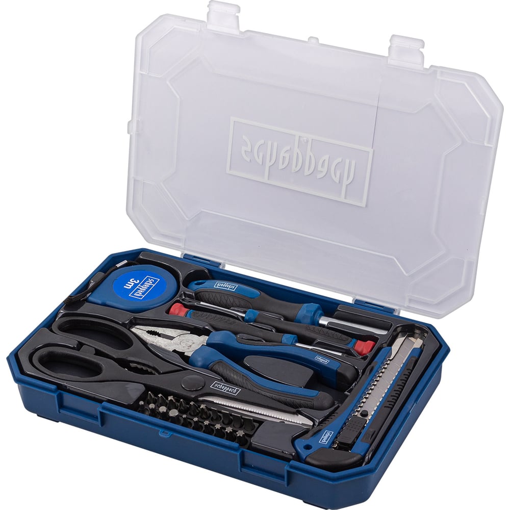 Набор универсальных инструментов 27 предметов от немецкого бренда Scheppach. Этот комплект включает в себя наиболее популярные инструменты для слесарных и монтажных работ: 2 отвертки крестовую и шлицевую длиной 50 мм, универсальный нож, рукоятку-битодержатель с набором бит (20 шт.), ножницы, измерительную ленту - 3 м., комбинированные плоскогубцы, которые станут незаменимыми помощниками дома или на даче для выполнения мелкого бытового ремонта. Преимущества набора Scheppach: Широкий выбор бит: включение бит Torx, Hex, Slotted, Phillips, Pozidriv обеспечивает возможность работы с различными крепежными элементами. Высокое качество материалов: Все инструменты изготовлены из прочных и износостойких материалов, что гарантирует долгий срок службы и надежность в любых условиях. Эргономичный дизайн: Инструменты удобно лежат в руке, что делает их использование комфортным и эффективным, даже при длительных работах. Удобство хранения и транспортировки: Набор поставляется в прочном пластиковом кейсе, который обеспечивает порядок и защиту инструментов, а также легкость их транспортировки. Набор инструментов будет полезен при ремонте и сборке мебели, техники, автомобилей и других устройств, где требуется работа с винтами и болтами. Они также могут использоваться в качестве профессионального инструмента для работы в автосервисе или на производстве, а также идеально подойдут для дома, дачи или гаража.