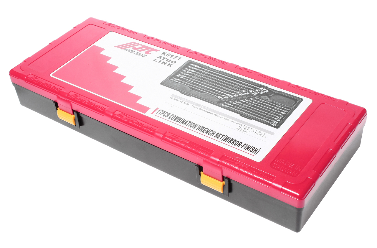 Артикулы JTC-АЕ1206-АЕ1223: ключ рожково-накидной (зеркальная полировка) 6 мм., 7 мм., 8 мм., 9 мм., 10 мм., 11 мм., 12 мм., 13 мм., 14 мм., 15 мм., 16 мм., 17 мм., 18 мм., 19 мм., 21 мм., 22 мм., 23 мм. - 17 шт.