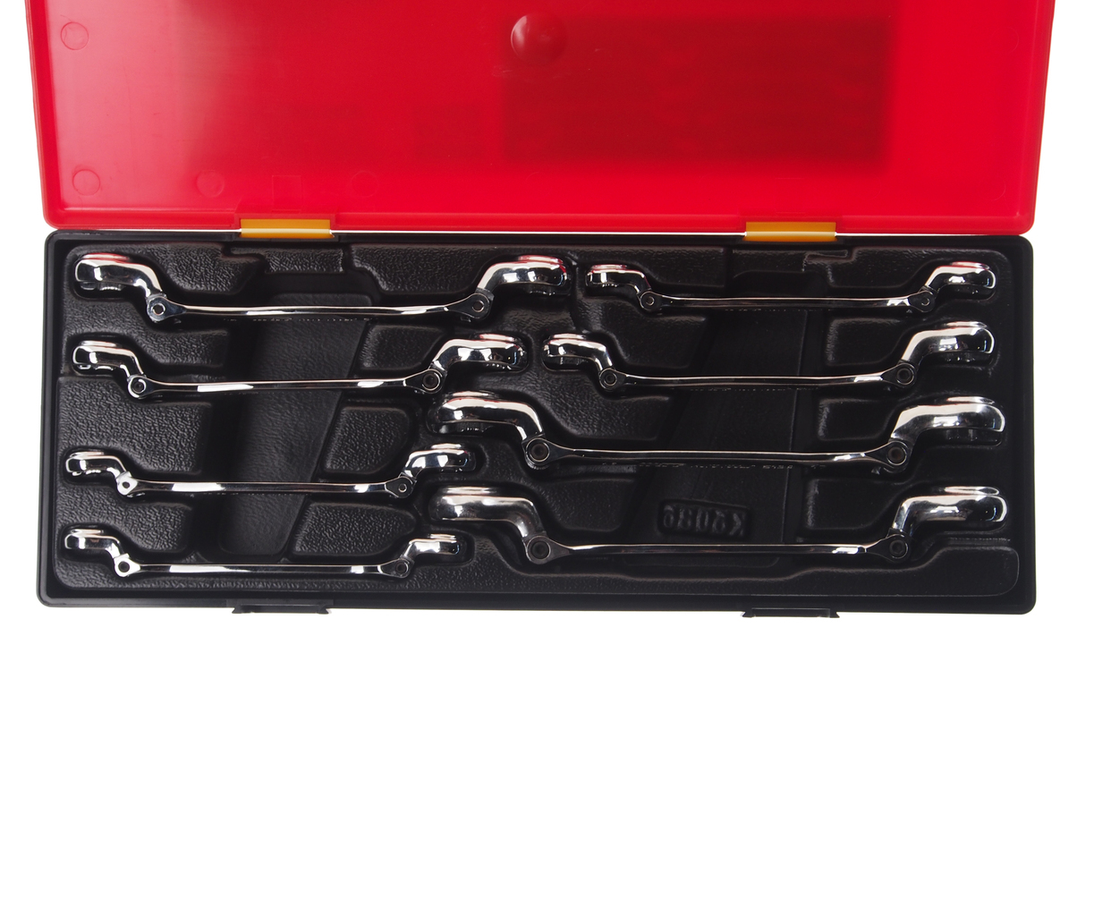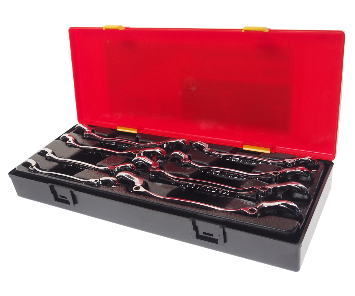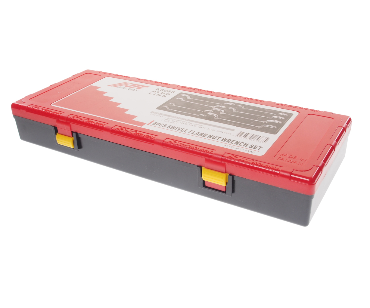 Комплектация: 8 шт. - ключ под конусную гайку с шарниром: 8х9, 10х11, 12х13, 14х15, 16х17, 18х19, 3/8"х7/16", 1/2"х9/16" (JTC-5134-5142).