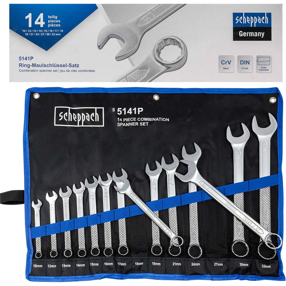 Ключи комбинированные, набор 14 предметов от немецкого бренда SCHEPPACH – универсальные гаечные ключи, совмещающие в себе функционал и преимущества рожковых и накидных ключей. Зевы комбинированных ключей имеют одинаковые размеры. Ключи гаечные с открытым и кольцевым зевами предназначены для монтажа либо демонтажа резьбовых соединений. Накидная часть ключа 12-гранная.Немецкое качество. Инструменты премиум-класса выполнены из высокопрочной CRV стали, что обеспечивает его надежность и долговечность, а также устойчивость к износу.Универсальность применения. Гаечный ключ один из наиболее часто применяемых ручных инструментов. Он используется практически во всех сферах деятельности: на производстве, в мастерских, сервисных центрах, гаражах, коммунальном и сельском хозяйстве, а также в быту.Удобство использования. Ключи фиксируются на полотне, которое имеет специальные отверстия в верхних углах полотна, для фиксации его на стене. При необходимости, набор ключей можно взять с собой в дорогу, полотно скручивается для удобства транспортировки и хранения.