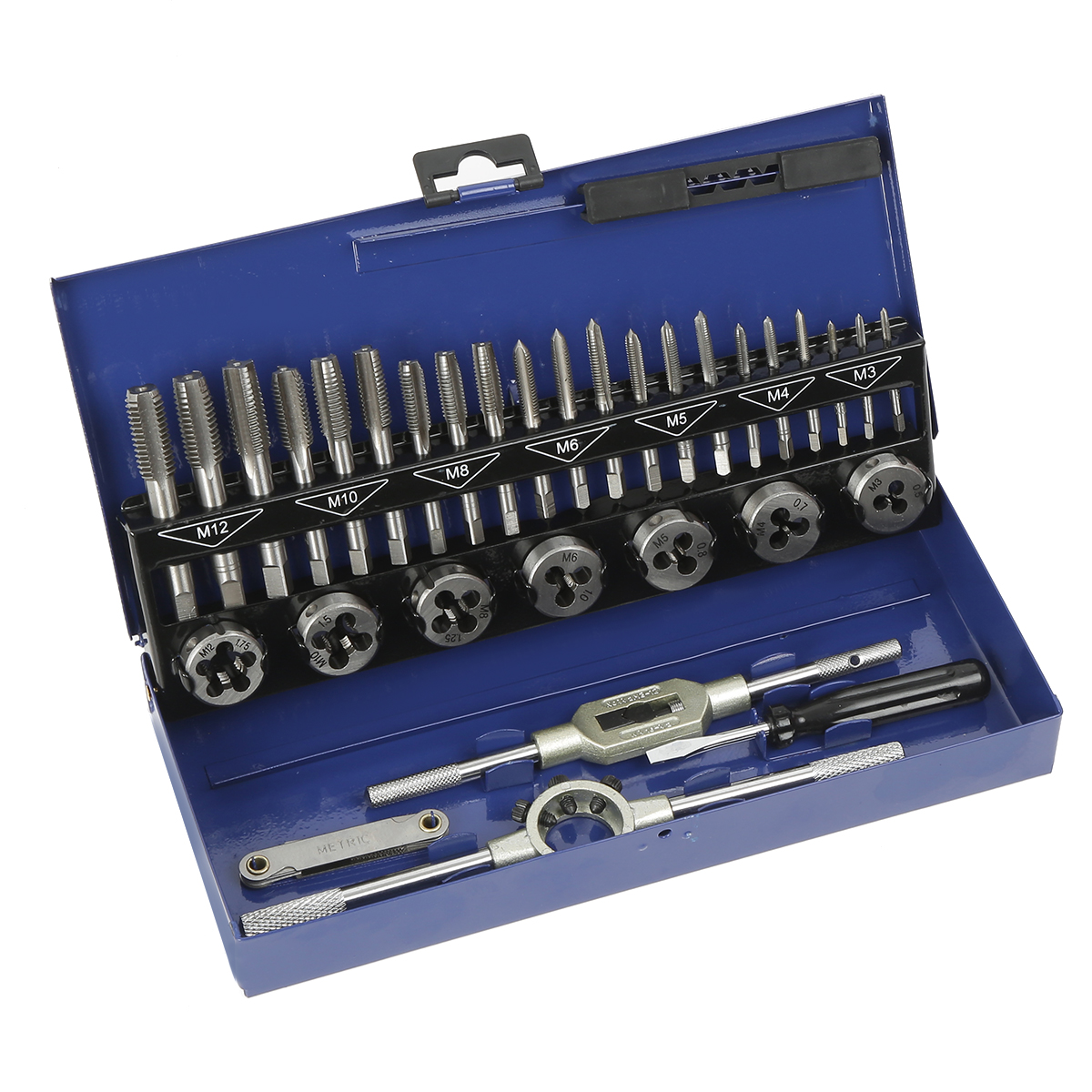 Набор резьбонарезного инструмента метрической резьбы М3-М12 для нарезания внутренних и наружных резьб. Инструмент изготовлен из инструментальной легированной стали 9ХС. Набор позволяет работать с цветными металлами, сталью и другими материалами. Набор представлен в металлическом кейсе для удобства транспортировки и хранения. В наборе 32 предмета. Преимущества Прочность, агрессивный рез и высокие показатели твёрдости Улучшенное качество Инструментальная легированная сталь 9ХС высокой твердости Ходовые размеров резьб от М3 до М12 Четкая маркировка Прочный металлический кейс с металлическими застежками Технические характеристики Направление резьбы - правая Количество в наборе - 32 шт Сталь - 9ХС Шаг метрической (М) Комплектация - метчики и плашки, измеритель шага резьбы, отвертка Метрическая резьба - М3-М12 Минимальный размер резьбы М (метчики) - М3 Вид упаковки - металлический кейс Вес, кг: 1.37 Длина, мм: 260 Ширина, мм: 120 Высота, мм: 35 Тип резьбы - метрическая (М) Комплектация Плашки 3х0,5, 4х0,7, 5х0,8, 6х1,0, 8х1,25, 10х1,5, 12х1,75 Метчики М3, М4, М5, М6, М8, М10, М12 (0.5, 0.7, 0.8, 1.0, 1.25, 1.5, 1.75) Метчикодержатель М3–М12 Плашкодержатель Ф25 мм: М3–М12 Измеритель шага резьбы Отвертка SL3 Металлический кейс.