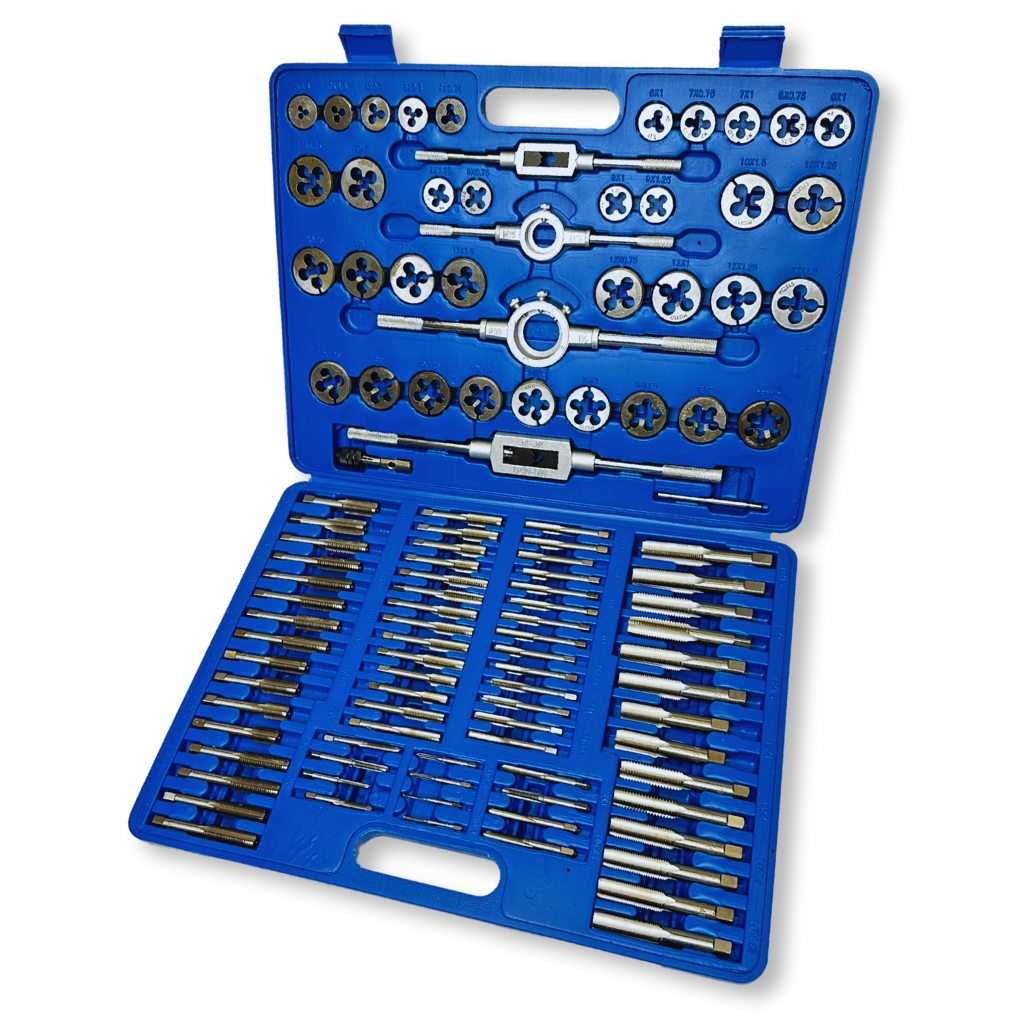 Набор метчиков и плашек, 110 предметов применяется для выполнения резьбонарезных работ. Все компоненты набора изготовлены из стали марки 9ХС Набор поставляется в удобном кейсе, оснащенном ложементами для каждого предмета. Широкая комплектация - в наборе 110 предметов. Комплектация 35 конических метчиков: М2x0,4; М3x0,5; М4x0,7; М5x0,8; М6x0,75; М6x1,0; М7x0,75; М7x1,0; М8x0,75; М8x1,0; М8x1,25; М9x0,75; М9x1,0; М9x1,25; М10x0,75; М10x1,0; М10x1,25; М10x1,5; М11x0,75; М11x1,0; М11x1,25; М11x1,5; М12x0,75; М12x1,0; М12x1,25; М12x1,5; М12x1,75; М14x1,0; М14x1,25; М14x1,5; М14x2,0; М16x1,0; М16x1,5; М16x2,0; М18x1,5. 35 цилиндрических метчиков: М2x0,4; М3x0,5; М4x0,7; М5x0,8; М6x0,75; М6x1,0; М7x0,75; М7x1,0; М8x0,75; М8x1,0; М8x1,25; М9x0,75; М9x1,0; М9x1,25; М10x0,75; М10x1,0; М10x1,25; М10x1,5; М11x0,75; М11x1,0; М11x1,25; М11x1,5; М12x0,75; М12x1,0; М12x1,25; М12x1,5; М12x1,75; М14x1,0; М14x1,25; М14x1,5; М14x2,0; М16x1,0; М16x1,5; М16x2,0; М18x1,5. 35 плашек: М2x0,4; М3x0,5; М4x0,7; М5x0,8; М6x0,75; М6x1,0; М7x0,75; М7x1,0; М8x0,75; М8x1,0; М8x1,25; М9x0,75; М9x1,0; М9x1,25; М10x0,75; М10x1,0; М10x1,25; М10x1,5; М11x0,75; М11x1,0; М11x1,25; М11x1,5; М12x0,75; М12x1,0; М12x1,25; М12x1,5; М12x1,75; М14x1,0; М14x1,25; М14x1,5; М14x2,0; М16x1,0; М16x1,5; М16x2,0; М18x1,5 2 метчикодержателя: М3 - М12, М6 - М20. 2 плашкодержателя: 25 мм и 38 мм. Т-образный быстрозажимной ключ для метчиков М3 - М6.