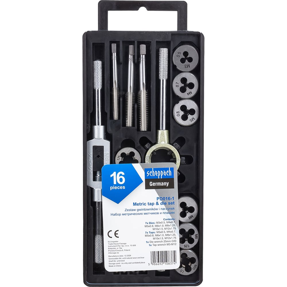Набор метчиков и плашек метрический Scheppach 16 предметов (М3x0.5, М4x0.7, М5x0.8, М6x1, М8x1.25, М10x1.5, М12x1.75) Sch-PD016-1(64899)