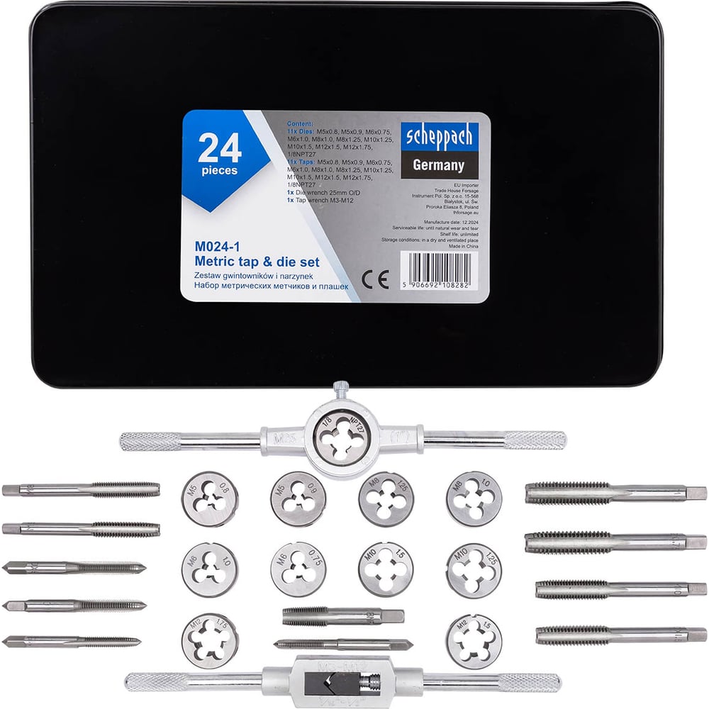 Набор метчиков и плашек метрический Scheppach 24 предмета (М5x0.8/0.9, М6x0.75/1, М8x1/1.25, М10x1.25/1.5, М12x1.5/1.75) Sch-M024-1(64906)
