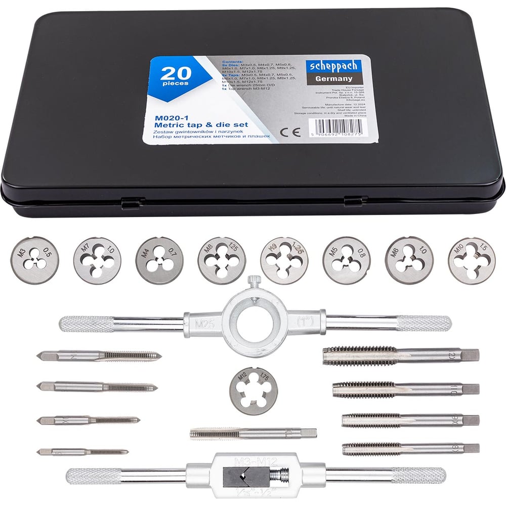 Набор метчиков и плашек Scheppach метрический 20 предметов (М3x0.5, М4x0.7, М5x0.8, М6x1, М7x1, М8x1.25, М9x1.25, М10x1.5, М12x1.75) Sch-M020-1(64905)