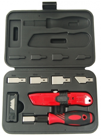 Область применения: Станции технического обслуживания. Автосервисы. Автомастерские. Особенности: Нож изготовлен из алюминиевого сплава. Держатель для лезвий изготовлен из алюминиевого сплава, имеет эргономичную рукоять из маслобензо стойкого полимера . Лезвия изготовлены из стали марки SK5 и имеют твердость 60-65HRC. Комплектация:: рукоятка для лезвий — 1 шт. нож для трапециевидных лезвий - 1 шт . лезвия скребковые - 5 шт. лезвия трапециевидные для ножа - 20 шт..