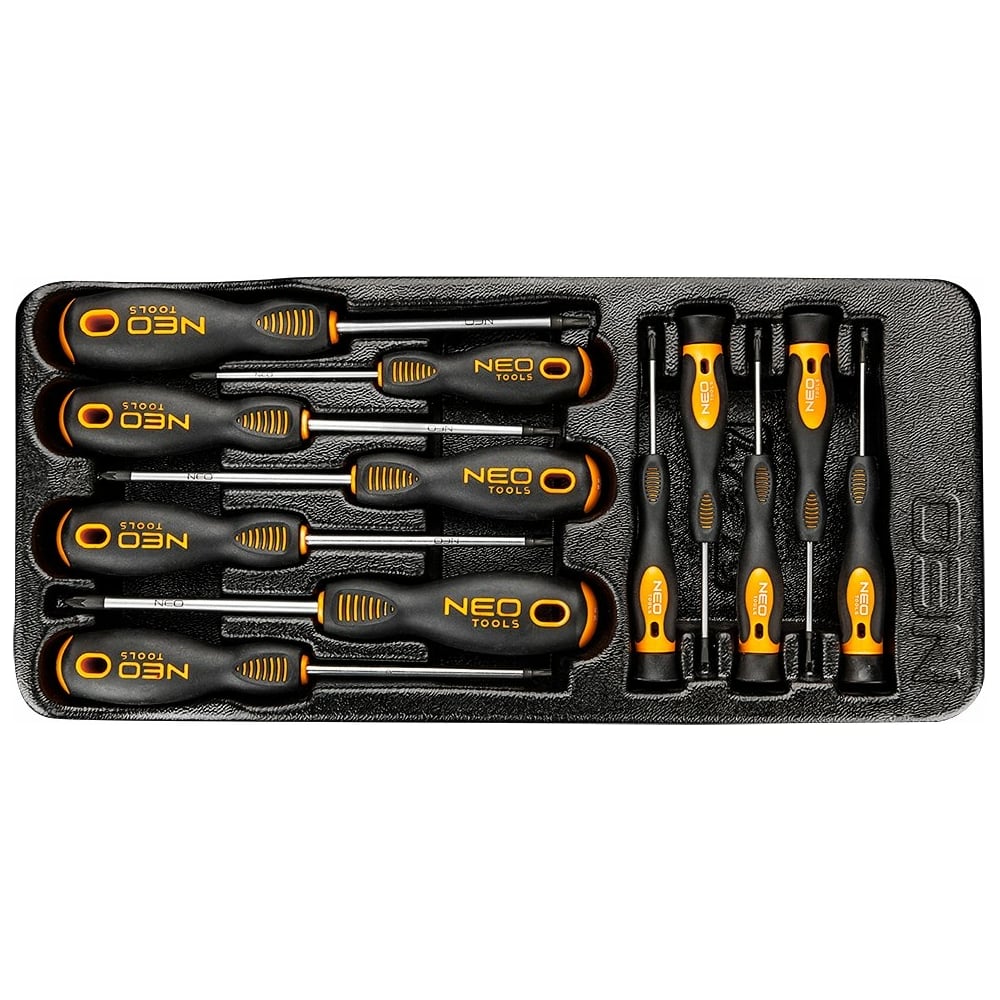 Набор отверток, 12 шт. PZ, TX NEO 84-247 поставляется в профилированном ложементе, который без труда размещается в специализированных инструментальных шкафах. Рабочие части отверток выполнены из стали S2 и подвергнуты термообработке, что обеспечивает твердость и стойкость к изгибу. Рукояти трехгранной формы способствуют удобному захвату в руке.