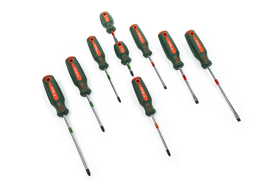 Набор отверток из 9 предметов Шлицевые: 5.5х100, 6.5х100, 6.5х150,6.5х38 мм Крестовые: PH1х100, PH2х100, PH2х150, PH2х38 Pozidrive: PZ1х100 (4”)