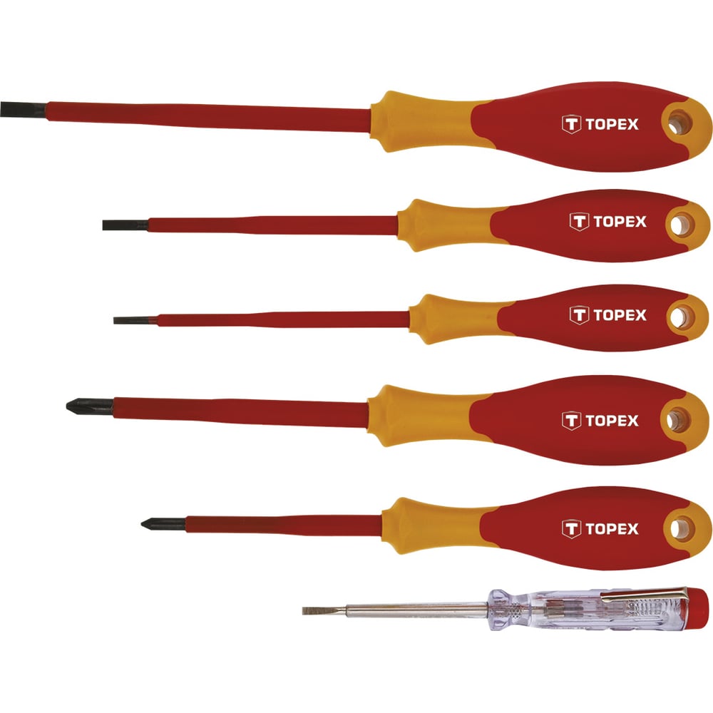 Набор отверток TOPEX 6 шт. 39D150 используется для работы под напряжением до 1000 В. Отвертки изготовлены из прочной высококачественной хромомолибденовой стали, что говорит о надежности и долговечности инструментов. Дополнительно в наборе имеется индикатор напряжения 125 - 250 В. Эргономичные пластмассовые рукоятки, покрытые антискользящим материалом, гарантирует комфортную и безопасную работу. Отвертки изолированны.