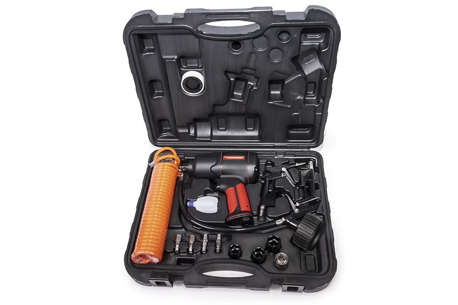Пистолет для накачивания шин -1 шт Пневмогайковерт 890 Нм - 1 шт Головки - 17 мм, 19 мм, 21 мм Продувочный пистолет - 1 шт Воздушный спиральный шланг 5 м - 1 шт Фитинг - 5 шт Масленка - 1 шт