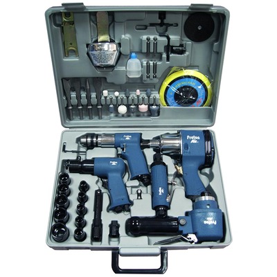 PA-ATK-52HD Состав: пневматический ударный гайковёрт 1/2” пневмодрель 3/8” пневматическое зубило шлифовальная машина бормашина прямая плоские биты 4, 6 (2 шт) PHILLIPS биты 2,3 (2 шт) шлифовальные камни 6мм и 3мм (10 шт) зубило (4 шт) ударные головки 9-10-11-13-14-17-19-22-24-27мм (10 шт) защитная крышка отрезной диск (3”х3/8”х1 1/16”) гаечный ключ удлинитель 1/2”х5”L адаптер 12”Fх3/8”М шлифовальный круг диаметром 6” наждачная бумага 6” разъем к воздушному шлангу патрон 1/8” и 1/4” или 3мм и 6 мм масленка ключ для патрона шестигранный ключ 4мм